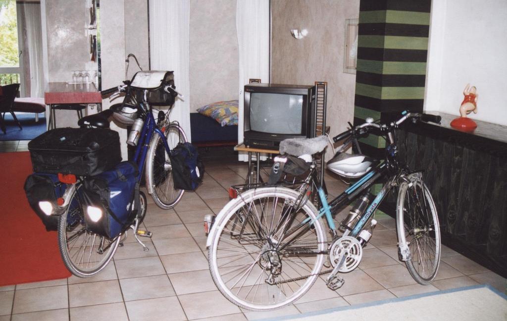 WeserradwegHan. Münden - BremerhavenTag 5: Wienbergen - BremenOrientalische Luxussuite... Nachdem wir wieder gut geschlafen und sehr gut gefrühstückt hatten, machten wir uns noch ein paar Brote für unterwegs. Unsere nette Wirtin gab uns noch ein paar Tüten zum Einpacken. Wir unterhielten uns noch eine Weile mit ihr und fuhren erst gegen 10 Uhr 15 los. Das Wetter war ideal zum Radfahren, kein Regen, kein Wind und angenehme Temperaturen. Wir kamen flott voran. Kurz vor 12 Uhr waren wir schon in Verden an der Aller. Hier machten wir mit unseren Fahrrädern einen Bummel durch die Innenstadt. Ich kaufte ein schwarzes Gummiband, das ich auf dem Koffer meiner Radtaschen befestigte. Somit hatte ich einen fahrbaren Wäschetrockner. Wenn man am Abend ein Rad - T-Shirt auswäscht, es gut in ein Handtuch einrollt und am nächsten Tag durch die Sonne fährt, ist es in einer halben Stunde trocken. Wir suchten auch noch mal wieder eine Fahrradwerkstatt auf. Dort wollten wir versuchen, für Hildegards Lenkertasche eine neue Befestigung zu kaufen, da sie bei dem kleinen Unfall am Vortag verloren gegangen war. Der Fahrradmonteur sah sich das Rad an und entdeckte dabei, dass die Schutzblechhalterung nicht kaputt, sondern nur lose war. Sie musste nur einfach wieder zusammengesteckt werden. Er dachte bestimmt: typisch Frauen. Bezahlt haben wir seine Bemühungen mit Bonbons, Geld wollte er nicht. Wir hatten wieder einmal Glück gehabt. Einige Kilometer hinter Verden führte unser Weg an einer Storchenaufzuchtstation vorbei. Dort machten wir eine ausgedehnte Pause und beobachteten fasziniert die Störche bei ihren Aktivitäten. Wieder kamen, genau wie am Tag zuvor, uns bekannte Radfahrer vorbei. Auch "unser Speyrer" war wieder dabei. Auch diesmal setzten wir die Fahrt gemeinsam fort. In Achim trennten sich dann endgültig unsere Wege. Obwohl wir laut Karte eigentlich auf der linken Weserseite fahren sollten, blieben wir bis Bremen auf dem rechten Weserufer. Einige Kilometer vor Bremen wurde es ungemütlich. Wir fuhren durch ein riesiges Industriegebiet. Mit Hilfe eines einheimischen Radfahrers, fanden wir dann doch den Weg in Richtung Innenstadt. Direkt das erste Hotel steuerten wir an und versuchten unser Glück. Es war ein kleines Hotel in einer Häuserzeile, nur durch sein Reklameschild als Hotel zu erkennen. Im Haus selbst war nichts mehr frei, aber die Hotelchefin bot uns ein Apartment, ein paar Häuser weiter an. Auf meine Frage, ob wir die Räder auch unterstellen könnten, meinte sie, in dem Wohnzimmer sei Platz genug, wir sollten sie einfach mit rein nehmen. Der Preis war auch o.k. und so stimmten wir zu. Als wir die Wohnungstüre öffneten, blieb uns fast die Spucke weg. Wir konnten es nicht fassen. Es war eine komplette, modern und extravagant eingerichtete Wohnung von ca. 70 m². Im Wohnzimmer befand sich ein offener Kamin, eine große Sitzecke, ein Erker mit einem runden Tisch und eine Einbauküche. Außerdem befanden sich in dem Zimmer drei Betten, ein großes Futonbett und zwei kleinere Futonbetten. Alle Betten hatten Vorhänge aus weißem Baumwollstoff. Außerdem hatte die Wohnung ein Schlafzimmer mit Doppelbett und einem Tüllhimmel darüber. Natürlich gab es auch ein modernes Bad und ein Gäste-WC mit Dusche. Wir hatten das Gefühl, in einer fremden, bewohnten Wohnung zu sein. Wir fragten vorsichtshalber noch einmal nach, ob alles so seine Richtigkeit hat und ob der Preis für ein oder zwei Personen sei. Wir waren irgendwie "total von der Rolle." Nachdem wir uns geduscht und umgezogen hatten, fuhren wir mit der Straßenbahn in die Stadt. Dort trafen wir uns mit Hildegards Neffen Eugen, der in Bremen lebt. Gemeinsam gingen wir mexikanisch essen. Anschließend zeigte er uns noch etwas von der Stadt. Gegen 23 Uhr fuhren wir mit der Straßenbahn zurück zu "unserer" Wohnung. Die Fahrt war etwas unheimlich, es saßen einige verwegene Typen in der Bahn. Wir waren froh, das wir unbehelligt die Wohnung erreichten. Jeder Tag brachte neue Überraschungen.