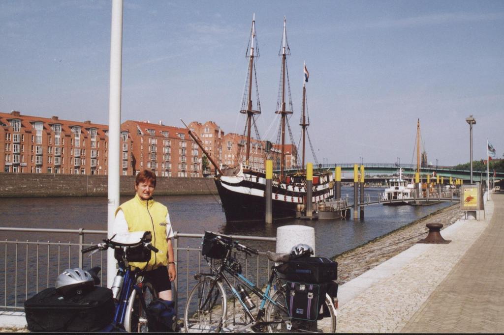 WeserradwegHan. Münden - BremerhavenTag 7: Bremen - BrakeSchlüsselerlebnis... Da wir für den heutigen Tag eine etwas kürzere Strecke geplant hatten, gönnten wir uns eine halbe Stunde mehr Schlaf. Gegen 8 Uhr standen wir auf und waren gegen 10 Uhr reisefertig. Die Fahrräder bepackten wir schon im Wohnzimmer. Kurz danach verließen wir die Wohnung. Hildegard zog die Türe hinter sich zu und bekam fast einen Herzinfarkt. Sie hatte den Schlüssel von innen stecken lassen. Ich dachte gleich an den "Superschlüsseldienst" der Rechnungen von 1000 DM und mehr schreibt und vor dem immer wieder in den Medien gewarnt wird. Mit schlotternden Knien ging Hildegard zum Hotel. Zwei Minuten später kam sie mit einer Hotelangestellten zurück, die sehr freundlich und kein bißchen verärgert war. Mit einem Draht öffnete sie die Türe und das Problem war beseitigt. Uns fiel ein Stein vom Herzen. Erleichtert machten wir uns auf den Weg. Das Wetter meinte es mal wieder gut mit uns. Die Sonne lachte vom Himmel und es blies ein leichter Südwestwind. Zunächst fuhren wir am Weserufer entlang Richtung Stadtmitte. Dort kauften wir Proviant und hatten noch ein kurzes Wiedersehen mit dem Neusser Ehepaar aus dem Zug. Sie wollten am nächsten Tag von Bremen aus, per Bahn, die Heimreise antreten. Auch sie waren von der Tour begeistert. Nach dem Zwischenstopp ging es über die letzte Weserbrücke auf die linke Weserseite. Solch eine Brücke hatte ich vorher noch nie benutzt. Der Radweg verlief seitlich unterhalb der Autospur. Es war ein Gefühl wie bei einem Erdbeben, wenn die Autos über einem hinweg fuhren Der Weg verlief dann einige Kilometer an einem Industriegebiet vorbei. Danach ging es immer am Deich entlang und kurze Stücke auch über den Deich. An einem Jachthafen machten wir unsere Mittagspause. Wir fuhren schneller als sonst und machten weniger, dafür aber längere Pausen. So gefällt es mir am besten. Wir kamen durch viele kleine Orte mit alten Reetdachhäusern. Manchmal hatte man das Gefühl, es seien Puppenhäuser oder man wäre in einem Freilichtmuseum. Kurz vor Elsfleth mußten wir noch eine unfreiwillige Mutprobe bestehen. Der Weg führte über ein hohe Eisenbahnbrücke, nur durch einen Maschendrahtzaun und einem Meter Abstand, von den Gleisen getrennt. Zum Glück kam bei der Überquerung kein Zug vorbei. In Elsfleth erholten wir uns Eiskaffe und Kuchen. Nach etwa zehn Kilometern erreichten wir gegen 16 Uhr Brake. Dort herrschte großer Trubel. Es war Stadtfest. In der Innenstadt standen Buden und Karussells. Über die Touristeninformation fanden wir auch noch eine Unterkunft. Es war wieder mal ein Glücksgriff. Wir bekamen eine kleine aber urgemütliche Ferienwohnung. Die Einrichtung war friesisch blau und weiß. Es war fast zu schade, das wir nicht länger bleiben konnten. Nachdem wir uns geduscht hatten, machten wir einen kleinen Kirmesbummel. Anschließend gingen wir in einem Lokal, direkt am Deich, mit Blick auf die nun schon recht breite Weser und ebenfalls großen Schiffen, essen. Es war mal wieder ausgezeichnet. Wir lebten nicht schlecht. Die Essenszeit hatten wir auch richtig gewählt. Während wir gemütlich im Trockenen saßen, goß es draußen in Strömen. Wir waren relativ früh in der Wohnung und erzählten noch lange, bei gebrannten Mandeln und Wasser, über Gott und die Welt. Kurz bevor wir zu Bett gingen brach dann draußen ein Höllenlärm los. Es krachte an allen Ecken und Kanten. Das dazugehörige Feuerwerk konnten wir leider von unserer Wohnung aus nicht sehen und zum raus gehen waren wir nicht mehr passend angezogen. Der Tag war aber auch ohne Feuerwerk sehr schön.