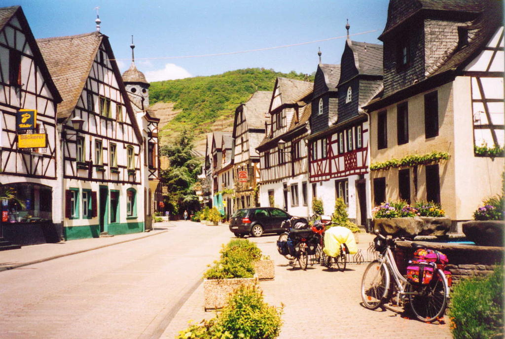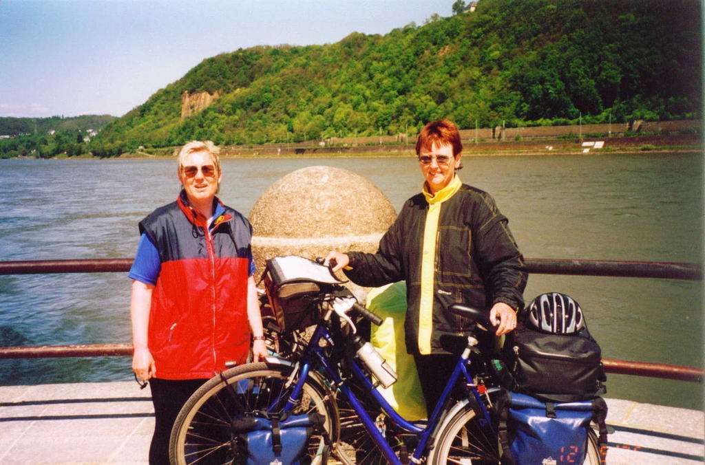 MoselradwegPerl - Koblenz - KrippTag 6: Pommern - Koblenz - 12.05.2005Am Deutschen Eck... Das Frühstück nahmen wir heute mit Blick auf die Mosel ein. Wir durften uns auch wieder ein Brötchen für unterwegs mitnehmen. Nach den obligatorischen Fotos vom Haus ging es um 10 Uhr los. Der Himmel war blau. Nur ein paar Schönwetterwolken waren zu sehen. Es war auch wärmer als an den Vortagen. Der Weg verlief ein langes Stück auf dem Randstreifen, direkt neben der Straße. Dieses Teilstück wird oft angegeben, wenn jemandem der Moselradweg nicht gefallen hat. Es hört sich dann immer so an, als ob der gesamte Moselradweg direkt neben der Straße verliefe. Rechts und links des Flusses sah man immer wieder Burgen oder Ruinen. Die Burgherren haben sich immer die besten Plätze ausgesucht. Wir hätten gerne die Burg Eltz gesehen, aber die lag versteckt hinter einem Berg und der Anstieg wäre mit unseren Fahrrädern sicher auch sehr mühsam gewesen. Man kann ja noch mal wiederkommen. In Löf machten wir unsere Einkäufe für den Tag, wovon ein großer Teil direkt verzehrt wurde. Ab Lehmen begann wieder ein separater Radweg. Im alten, malerischen Ortskern von Gondorf machten wir eine Kakao- bzw. Eispause. Es war mal wieder ein besonders schönes Fleckchen Erde. Danach ging es zügig weiter. Die Landschaft hatte sich auf der langen Tour verändert. Am Beginn der Reise, bestanden die Hänge fast nur aus Weinreben, mittlerweile gab es neben Weinreben oft felsige Abschnitte mit Sträuchern, niedrigen Bäumen und gelegentlichen Grasflächen. Wir fuhren heute die gesamte Strecke am linken Moselufer entlang, meist unmittelbar neben einer Bahnlinie. In Güls überquerten wir die Mosel und gelangten nach Koblenz. Am deutschen Eck, am Zusammenfluß von Mosel und Rhein, war dann das Ende unserer Moseltour erreicht. Irgendwie ist das für mich immer so etwas wie ein historischer Moment. Wir machten einige Erinnerungsfotos, wobei auch die Festung Ehrenbreitstein ein willkommenes Motiv war. Wir haben sie aber nur von unten abgelichtet. Der Weg hinauf war uns zu mühsam. Danach gingen wir in die Altstadt zur Touristeninformation und orderten ein Zimmer für die Nacht. Diesmal ohne Dusche, doch dafür bezahlbar und zentral gelegen. Nachdem wir uns frisch gemacht hatten, gingen wir zu Fuß zurück in die Innenstadt. Wir bummelten durch eine Buchhandlung und machten uns schon mal Gedanken über unsere Tour im nächsten Jahr. Wir haben auch schon was ins Auge gefaßt. Das Wetter war so angenehm, daß wir unser Abendessen, eine Pizza, draußen einnehmen konnten. Um 20 Uhr trafen wir uns dann mit Mecki, einem alten Freund von Klaus und erzählten von unserer Radtour. Die Moseltour war sehr schön und vor allen Dingen leicht zu fahren. Wir hatten auch im Gegensatz zu manch anderer Tour, nie Schwierigkeiten bei der Herbergssuche. In der Zeit der Weinfeste sieht es sicherlich damit anders aus. Etwas Gutes hat die Tour noch: die Woche ist noch nicht zu Ende und morgen dürfen wir noch ein Stück weiter fahren. Als wir im Bett lagen, erreichte uns noch ein Hilferuf von nebenan. Eine junge Frau saß auf der Toilette und hatte sich eingeschlossen Voller Panik hämmerte sie gegen die Türe. Letztendlich schaffte sie es dann doch noch sie aufzuschließen.