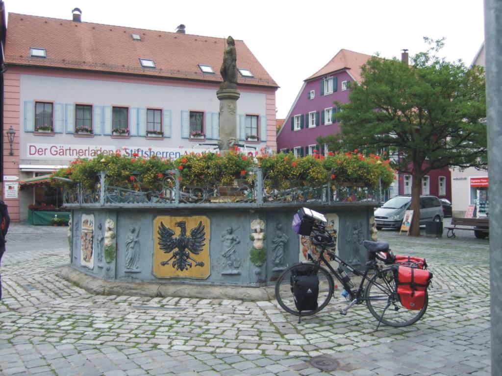 DeutschlandtourFlensburg - FüssenTag 15: Creglingen - Dinkelsbühl / Neustädtlein - 16.09.2008Retter in der Not... Als ich am Morgen die Gaststube betrat, saß überraschender Weise ein Mann im Radleroutfit am Frühstückstisch. Ich war der Meinung, ich wäre der einzige Gast. Wir unterhielten uns angeregt und teilten uns Aufschnitt und Käse. Nachdem wir fast fertig waren, kam die Wirtin und entschuldigte sich. Sie hatte glatt vergessen, meine Portion aus dem Kühlschrank zu nehmen. Kurz nach 9 Uhr ging’s dann durchs Taubertal weiter. Da man ja, wenn man alleine unterwegs ist, normalerweise leise daher kommt, hatte ich sogar die Gelegenheit, vier Rehe zu beobachten, die meinen Weg kreuzten. Über solche unerwarteten Begegnungen freue ich mich immer. Ich überlegte, ob ich nach Rothenburg hineinfahren sollte, oder direkt unten durchs Tal weiter fahren sollte. Wer weiß, wann ich die Gelegenheit wieder haben werde, Rothenburg einen Besuch abzustatten und deshalb entschied ich mich, den steilen Weg hinauf zu schieben und die romantische Stadt noch einmal zu besuchen. In der Stadt wimmelte es mal wieder von Touristen aus aller Herren Länder. Da ich die Stadt kannte, schob ich mein Rad nur einmal über den Rathausplatz und genoß dann den Blick von oben hinab auf die Tauberbrücke. Die Erinnerung an einen Besuch zu Pfingsten vor einigen Jahren wurde wieder wach. Die ganze Stadt war eine einzige Bühne. Der bekannte Meistertrunk wurde aufgeführt. Das große Feuerwerk vor dem Rathhaus und am nächsten Abend die „brennende Stadt“ sind mir noch sehr präsent. Ich blieb etwa eine Stunde und machte ich mich dann auf meinen weiteren Weg. Zu Anfang gab es eine kleine Schikane. Weil eine Brücke erneuert wurde, mußte ich auf einen schmalen Trampelpfad ausweichen und dort sogar einige Stufen hoch. Das schaffte ich nur, indem ich die Lowridertaschen abnahm und Rad und Taschen getrennt die Treppe hinauftrug. Es ging dann auf der romantischen Straße weiter. Die nächsten Kilometer waren relativ eben. Als ich mich Schillingsfürst näherte, sah ich schon von weitem, was auf mich zukam. Die Stadt lag oben auf einem Berg. Da hinauf kam ich natürlich nur zu Fuß. Die Gegend wurde wieder hügeliger. Das Gute daran ist, daß nach einem Berg die Abfahrt folgt. Am Marktplatz in Feuchtwangen machte ich Mittagspause. Das Wetter war besser als am gestrigen Nachmittag. Es war trocken, aber kühl und trüb. Frisch gestärkt ging’s danach weiter bis Dinkelsbühl. Von dieser schönen Stadt war ich sehr begeistert. Sie ist ein echtes Schmuckstück. Ich schob mein Rad durch die Straßen. Hier wollte ich auf jeden Fall bleiben, evtl. sogar zwei Tage. Zunächst versuchte ich in der JH ein Zimmer zu bekommen. Die hatte aber leider geschlossen. Bei der tel. Nachfrage lief nur ein Band. Der Besuch der Touristeninformation brachte mich auch nicht richtig weiter. Zimmer in Pensionen waren nach Angaben der Angestellten nicht mehr frei. Sie schlug mir zwei Hotels vor, die mir aber ehrlich gesagt zu teuer waren. Sie gab mir noch ein Gastgeberverzeichnis und schon war ich entlassen. Da stand ich nun und wußte nicht weiter. Es war mir schon zu spät zum Weiterfahren. Die nächsten Städte waren kleiner und es war fraglich, ob ich unterwegs etwas finden würde. Kurz bevor ich Dinkelsbühl erreicht hatte, hatte ich ein Schild mit dem Hinweis „Zimmer für Radfahrer“ gesehen. Ich fuhr also noch mal ein bis zwei Kilometer zu diesem Schild zurück. Es war eine Telefonnummer angegeben, aber es meldete sich niemand. Pech! Frustriert und enttäuscht entschied ich mich dann doch ins Hotel zu gehen. Da viel mir ein, ich hatte ja noch das Unterkunftsverzeichnis. Vielleicht stand ja auch was vom Umland darin. Während ich so dastand und in dem Heft blätterte, stoppte ein Radfahrer und fragte: „do you need help?“ Schon komisch, in Deutschland auf englisch angesprochen zu werden. Der Mann war wirklich nett und mein Retter in der Not. Er war aus der Gegend. Gemeinsam suchten wir nach einer Unterkunft in der Umgebung. Er empfahl mir einen Gasthof im Nachbarort. Dort war ein bezahlbares Einzelzimmer zu haben. Es wäre kompliziert gewesen, den Weg zu erklären. Deshalb fuhr er noch ein ganzes Stück vor mir her, bis ich den Weg nicht mehr verfehlen konnte. Meine Stimmung, die vorher auf dem Tiefpunkt war, war schlagartig besser. Solche Begegnungen vergißt man nicht so schnell. Wenig später ereichte ich den Gasthof in Neustädtlein.