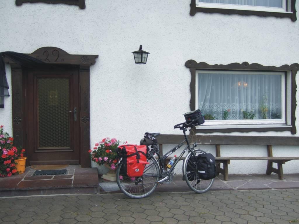 DeutschlandtourFlensburg - FüssenTag 24: Füssen - Emmerich (Zugfahrt) - 25.09.2008City Night Line... Leider war am letzten Tag das Wetter so neblig, daß ich die Berge nicht mal ahnen konnte. Ich hatte mir wenigstens zur Abfahrt einen schönen Blick auf die Alpen gewünscht. Es würde ein langer Tag werden, deshalb packte ich auch erst nach dem Frühstück meine Sachen und legte mich noch mal eine Stunde aufs Bett, um meinen Krimi weiter zu lesen. Der Zug ab Augsburg fuhr erst kurz vor Mitternacht. Am späten Vormittag startete ich dann zur Heimreise. In kurzer Zeit war ich am Bahnhof in Füssen. Als mein Zug eintraf, stürmte eine ganze Schulklasse in die Wagen. Zwei freundliche dazugehörige Lehrer halfen mir mit dem Rad beim Einsteigen. Gemütlich und mit reichlich Stopps ging’s dann bis Augsburg. Ich hatte vorher darüber nachgedacht, mein Gepäck in einem Schließfach am Bahnhof zu deponieren, um mir dann die Stadt in Ruhe noch mal anzuschauen. Am Bahnhof angekommen, fragte ich einen Bahnhofsmitarbeiter nach den Schließfächern. Er wies mich auf eine Radstation hin. Das war natürlich noch besser. Für einen Euro konnte ich mein Rad mit Gepäck unbesorgt dort stehen lassen. Nur mit Lenkertasche unternahm ich dann einen ausführlichen Stadtbummel. Zuerst besuchte ich die kleine ev. Kirche St. Ulrich und Afra. Sie war vor der Reformation Eingang und Sakristei der kath. Pfarrkirche. Das niedrige Gebäude, mit seiner weißen Stuckdecke und der dunklen Holzvertäfelung an den Wänden und der Galerie, machte auf mich einen ungewöhnlichen, aber schönen Eindruck. Erst vor kurzem wurde sie renoviert. Die große Basilika dahinter war geschlossen, weil sie ebenfalls renoviert wurde. Ich finde es bemerkenswert, daß die Kirchen beider Konfessionen sich in einem Gebäudekomplex befinden. Im Laufe des Nachmittags bummelte ich durch viele große Kaufhäuser. Wenn man nicht zum Einkaufen unterwegs ist, ist das auf die Dauer doch langweilig. Bei Sonnenschein hätte ich bestimmt eine Weile in einem Straßencafe oder auf einer Parkbank verbracht, aber dafür war das Wetter zu ungemütlich. In einer großen Buchhandlung fand ich dann noch Lesestoff für den Abend. Bei Einbruch der Dunkelheit wurde es mir in der Stadt etwas ungemütlich. Nach einem Imbiß ging ich zum Bahnhof. Kurz vor 20 Uhr holte ich mein Fahrrad aus der Radstation ab. Die letzten Stunden verbrachte ich lesenderweise in der Bahnhofshalle. Hier fühlte ich mich sicher. Es gab eine Infostelle mit Fahrkartenverkauf und die Bahnpolizei kam mehrfach herein, um einen Blick auf die Bahnreisenden zu werfen. Was mich erstaunte und in meiner Heimat sehr unüblich ist, waren viele junge Leute in Tracht (Lederhosen und Dirndl). Sie kamen wahrscheinlich vom Münchener Oktoberfest. Mit etwas Verspätung kam mein Nachtzug gegen 23.30 Uhr an. Der Gepäckwagen hatte breite Türen und so schaffte ich es alleine, mein Rad in den Zug zu wuchten. Als ich das geschafft hatte, ging es mir besser. Nun mußte ich nur noch das richtige Abteil finden. Mit meinem großen Gepäck mußte ich durch mehrere Wagen laufen. Zuerst sah es so aus, als ob das komplette Abteil belegt sei. Es waren fünf „mittelalte“ Ungarn drin, die sich ziemlich ausgebreitet hatten. Ich erhielt aber dann doch noch meinen gebuchten Sitzplatz. Die Rückfahrt war unbequemer als die Fahrt nach Flensburg; dafür waren aber meine Nerven ruhiger. Gegen 7 Uhr erreichte der Zug Emmerich. Als ich auf der Rheinbrücke stand und die Sonne über dem Wasser aufging, hatte ich das Gefühl, wieder zu Hause zu sein.. Es gibt in Deutschland und auf der Welt viele schöne Landschaften und Orte, aber hier am Niederrhein fühle ich mich am wohlsten und möchte nirgendwo sonst leben. Jetzt kam der Endspurt. Schnell und mit freudiger Erwartung erreichte ich Grieth und wurde dort schon am Ortseingang von meiner Schwester empfangen. Das war toll. Bei einem leckeren Frühstück erzählte ich von den Erlebnissen der letzten Wochen. Nach dem Mittagessen kam dann die definitiv letzte Etappe. Bei herrlichem Frühherbstwetter ging es nach Kalkar. Dort traf ich nach 3 ½ Wochen Klaus wieder. Von dort traten wir dann gemeinsam die Heimreise mit dem Auto an.