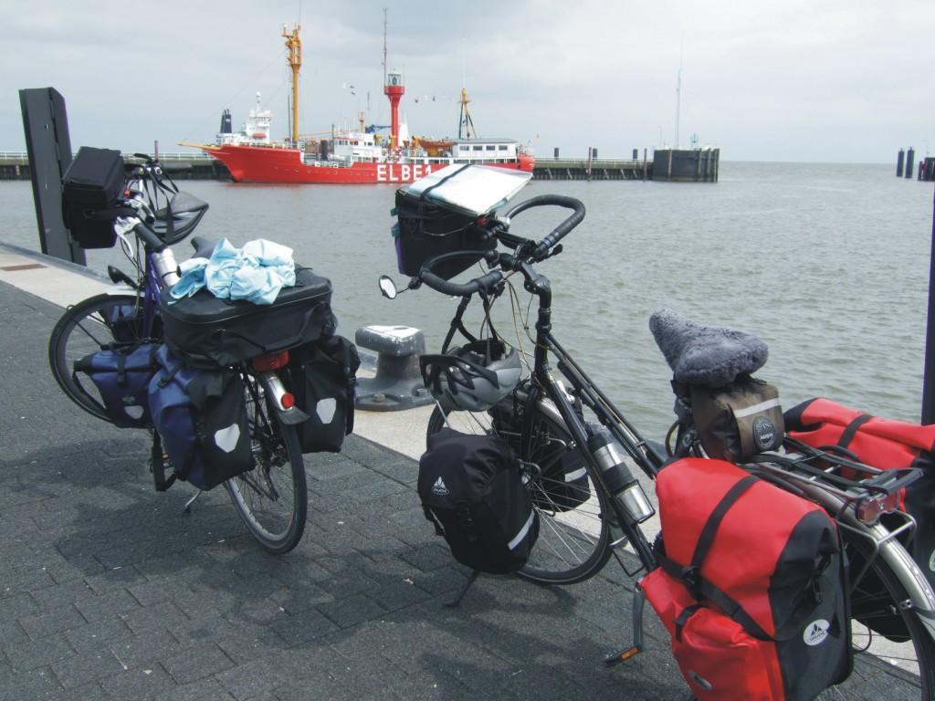 Elberadweg, Teil 2Magdeburg - CuxhavenTag 8: Krummendeich - Cuxhaven (Altenwalde) - 27.06.2009An der Nordseeküste... Gegen 9.30 Uhr ging es auf die letzte Etappe. Es sah ziemlich trüb aus, aber schon nach wenigen Kilometern konnten wir die Jacken ausziehen und fuhren, wie an den vergangenen Tagen, in kurzärmligen T-Shirts und kurzen Hosen. Der Wind meinte es gut mit uns und schob wieder. Gegen 11 Uhr erreichten wir Otterndorf. Dort machten wir eine kurze Pause mit Kakao und Suppe. Die Innenstadt bot wieder reichlich Fotomotive. Wir trafen auch einige Fahrradfahrer vom Vortag wieder. Dann telefonierten wir mit der Freundin meiner Tochter, die in Cuxhaven lebt. Sie wollte uns ein Zimmer besorgen. Sie war schon früh zur Touristeninformation gefahren, hatte aber nichts Passendes bekommen. Cuxhaven ist eine beliebte Stadt mit vielen Touristen. Zur Zeit waren alle bezahlbaren Pensionen besetzt. Die Hotels in der Innenstadt waren für unsere Portemonnaies zu teuer. Da wir am Vortag schon mal versucht hatten, ein Zimmer zu bekommen, besaßen wir noch die Adresse von einem Hotel in Altenwalde, einem Ortsteil, der 5 km außerhalb lag. Das wurde nun telefonisch gebucht und wir hatten eine Sorge weniger. Nun fuhren wir zügig weiter bis Cuxhaven. Die Landschaft war flach, wie erwartet, aber auch sonst gab es nicht viel zu sehen. Wenn wir in Otterndorf dem offiziellen Elberadweg gefolgt wären, hätten wir vielleicht das Meer gesehen. Möglicherweise auch nicht, wenn Ebbe gewesen wäre. Wir wollten aber jetzt zügig in Cuxhaven ankommen und kürzten die Strecke etwas ab. Wir besuchten zuerst den Hafen. Auf dem Weg dorthin fuhren wir am alten Fischereihafen vorbei. Dort gab es viele gut besuchte Fischlokale. Als wir dann zur „Alten Liebe“ kamen und auf das Meer schauen konnten, hatten wir das Ziel unserer Reise erreicht. Hier war unsere eigentliche Radtour zu Ende. Es war ein großartiges Gefühl. Die Woche war wieder unglaublich schnell zu Ende gegangen. Nun machten wir noch einige Fotos von uns, unseren Rädern und dem Meer. Vorher hatten wir schon am Bahnhof die Rückfahrkarten besorgt. Nun fuhren wir noch mal 5 km aus der Stadt heraus zu unserem Hotel. Wir wurden sehr freundlich empfangen und wegen unserer „enormen" Leistung vom Chef direkt bewundert. Das tat gut. Wir meldeten uns tel. bei unserer Bekannten. Nachdem wir uns stadtfein gemacht hatten, stand sie auch schon vor der Türe. Nun fuhren wir mit dem Auto zurück ins Zentrum und sie zeigte uns ihre Stadt. Wir warfen einen Blick in ihre Wohnung, in der sie eigenhändig dabei war sie zu renovieren und waren erstaunt, was sie schon alles geschafft hatte. Danach machten wir einen Bummel über den Deich. Obwohl noch keine Hauptsaison war, tummelten sich die Touristen. Das Durchschnittsalter lag dabei bei 65 Jahren. An den Strand durfte man nur mit Kurkarte. Die hatten wir nicht und Eintritt für den Strand wollten wir im übrigen auch nicht bezahlen. Wir konnten aber auch vom Deichweg aus auf das Meer sehen, nur leider nicht die Füße reinstecken. Die Strandkörbe, der Sand, die Schiffe und das Meer ergaben ein stimmungsvolles Bild. Es war schön hier. An der Strandpromenade tranken wir eine Kleinigkeit und fuhren anschließend zur „Alten Liebe“. Dort aßen wir, direkt am Hafen, mit Blick auf das Wasser, zu Abend. Unsere „Fremdenführerin" erzählte von ihrem ungewöhnlichen Leben und wir hörten fasziniert zu. Gegen 21 Uhr brachte sie uns zurück in unser Hotel. Es war ein sehr schöner letzter Tag gewesen. Es war wieder eine schöne Tour mit vielen neuen Eindrücken und Erlebnissen. Die Fahrt selbst verlief ohne Pannen und hat wie immer viel Spaß gemacht und Lust auf die nächste Tour.