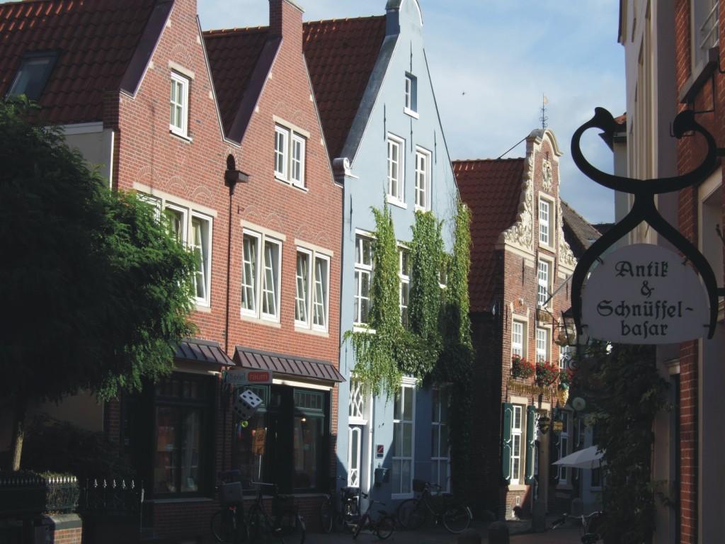 EmsradwegHövelhof - EmdenTag 5: Papenburg - Leer - 10.09.2009Historische Schiffe... Das Frühstück nahmen wir in Gesellschaft von dutzenden verschiedenen Puppen ein. Das ganze Zimmer quoll über vor Kitsch, angefangen von Rüschengardinen mit roten Schleifen und vergoldetem Besteck. Das Essen selbst war lecker und reichlich. Kurz vor 10 Uhr fuhren wir zunächst in die Innenstadt und dann zum Hafen. Dort besuchten wir im Forum „Alte Werft“, den Zeitspeicher. Der Stadtgründer Dietrich van Velen erklärt dort „höchstpersönlich“ die Entstehungsgeschichte der Stadt Papenburg. Mit interaktiven Exponaten und an Hand kurzer Filme, wird erklärt wie die ersten Torfhütten gebaut und die ersten Kanäle zum Entwässern angelegt wurden. Man erfährt außerdem vieles über den Schiffsbau. Eine Etage höher gab es eine weitere interaktive Ausstellung. Dort erhielten wir Einblicke ins ATP-Prüfgelände, das sich in der Nähe der Stadt befindet. Dort werden neue Autos, die sogenannten Erlkönige getestet. Wir hätten sehr gerne die Meyer-Werft besichtigt. Leider gab es für diesen Tag keine freien Besichtigungsplätze mehr. Somit fuhren wir dann nach einer guten Stunde in der Alten Werft, auf dem Emsradweg weiter. Der Weg führte unmittelbar am Gelände der Meyer-Werft vorbei. Leider war kein großes Schiff zu sehen, das auf dem Weg zur Jungfernfahrt war. Wir blieben auf der rechten Emsseite und fuhren am Deich entlang. Das Wetter war typisch für den Norden: windig. Natürlich kam der Wind von vorne. Es war außerdem bewölkt, aber trocken. Klaus hatte heute Probleme mit seinem Sattel. Ihm schmerzte der verlängerte Rücken. Diese Schwierigkeiten hatte er schon auf anderen Radtouren gehabt. Er hatte bisher noch nicht den richtigen Sattel gefunden, oder vielleicht hätte er vorher etwas mehr trainieren sollen. Wir machten häufiger kleine Pausen. Die Bänke auf dem Deich waren aber anscheinend nur für die Schafe gedacht, die dort herumliefen. Um dorthin zu gelangen, hätten wir über den Zaun steigen müssen. Die Gatter waren alle abgeschlossen. Wir kamen an einem schönen Windmühlenensemble in Mitling Mark vorbei. Es sah so aus, als hätte hier die Zeit stillgestanden. Wenig später erreichten wir die sogenannte Friesenbrücke, eine Eisenbahnbrücke, die teilweise abgebaut wird, wenn ein großes Schiff die Meyer-Werft verläßt. Dort konnten wir auch deutlich den Einfluß von Ebbe und Flut auf den Wasserstand der Ems erkennen, obwohl das Meer noch weit entfernt ist. Gegen 14 Uhr erreichten wir Leer. Hier machten wir für heute Schluß. Mit Hilfe der Touristeninformation bekamen wir ein sehr schönes Privatzimmer am Stadtrand. Nachdem wir uns stadtfein gemacht hatten, blieb genügend Zeit für eine ausgiebige Stadtbesichtigung. Die Altstadt und besonders der Museumshafen mit seinen historischen Schiffen, sind eine Reise wert. In Kapitän Brinkmanns Teestube tranken wir original Friesentee. Mich begeisterten die kleinen Schöpfkellen für die Milch ganz besonders. So etwas gibt es bei uns zu Hause nicht. Leider habe ich mir keines als Andenken gekauft. Das hätte noch gut in meine Tasche gepaßt. Nach dem Essen beim Chinesen fuhren wir dann früh zurück zu unserer Pension.