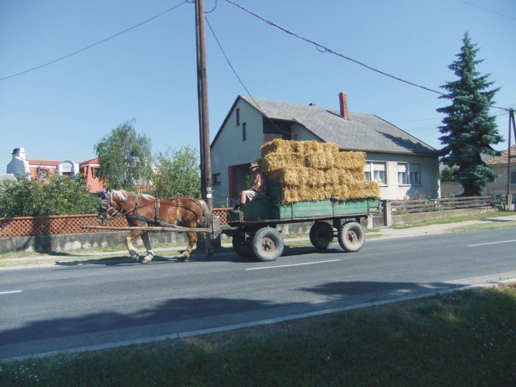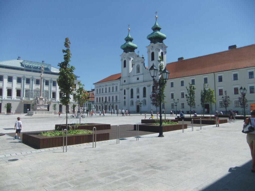Donauradweg 4Wien - BudapestTag 4: Mosonmagyarovar - Bana - 10.07.2010Italienisches Flair in Györ... Heute waren wir bereits um 9.15 Uhr startklar. Das Frühstück war zwar nicht so reichhaltig wie am Vortag, aber bedeutend besser als in Wien. Unser Weg führte zunächst über Halaszi bis Hedervar. Wenige Meter hinter dem Schloß machten wir in einem netten Gasthof eine Trinkpause. Bei diesem Wetter verdunstet die Apfelschorle im Körper, sobald sie durch die Kehle gelaufen ist. Danach ging es weiter bis Györ. Wir hielten unterwegs immer wieder kurz an, um Flüssigkeit nachzutanken. Gegen 12.30 Uhr erreichten wir die Stadt. Über eine eiserne Brücke, die eine gewisse Ähnlichkeit mit dem blauen Wunder in Dresden hat, fuhren wir in die Innenstadt. Es war Markt. Kurz vor Toresschluß erstanden wir Äpfel, Pfirsiche und Aprikosen. Die Aprikosen probierten wir direkt. Sie schmeckten hervorragend. Wir fuhren dann zum Szechenyiter, einem großen Platz, der von einer Benediktinerkirche mit zwei imposanten Türmen beherrscht wird. In der Mitte des Platzes befindet sich eine Mariensäule. Ein magischer Anziehungspunkt für Kinder waren die Wasserspiele auf dem Platz. Das Wasser spritzte in unregelmäßiger Folge aus Düsen am Boden. Die Kinder hatten einen riesigen Spaß, wenn sie durch die Wassersäulen liefen. Da wäre man gerne noch mal Kind! An einer Seite des Platzes befanden sich Restaurants und Cafes. Viele Menschen saßen an Tischen unter großen Sonnenschirmen und genossen den Sommer. Es hatte etwas von Italien. Wir gönnten uns ein Eis und anschließend Kaffee und Tee und beobachteten das Treiben. Nach zwei Stunden Siesta rafften wir uns auf und schoben die Räder durch die Fußgängerzone. Ein Thermometer zeigte 33° C im Schatten. Dann begann die Suche nach dem Radweg in Richtung Babolna. Wir fuhren einmal in großem Bogen um eine riesiges Einkaufzentrum. Eine freundliche Frau erklärte uns, daß wir in der verkehrten Richtung unterwegs seien. Also Kehrtwendung um 180°. Klaus wollte dann ein paar Meter abkürzen mit dem Ergebnis, daß wir in einem Industriegebiet landeten. Der Schweiß rann in Strömen. Wenn wir doch nur etwas ungarisch lesen könnten! Mit Händen und Füßen fragten wir ein paar junge Männer nach dem Weg. Wieder mußten wir ein Stück zurück und außerdem noch einen kleinen Hügel hinauf. Wir gelangten auf eine Landstraße. Dort fragten wir ein Pärchen auf Rädern, ob wir richtig seien. Der Mann sprach recht gut deutsch und hatte zudem noch eine Karte dabei. Unsere Bikelinekarte zeigt ja nur einen begrenzten Kartenausschnitt an, auf der unser Standort nicht mehr eingezeichnet war. Die beiden wollten in die gleiche Richtung. So ging es dann mit neuem Mut auf der Landstraße weiter. Glücklicherweise standen am Straßenrand Bäume und Büsche, so daß wir etwas Schatten hatten. Die Landschaft war ansonsten überwiegend flach. Große Getreide und Sonnenblumenfelder beherrschten das Bild. Leider gab es hier keinen Radweg. Es herrschte reger Autoverkehr. Trotzdem erreichten wir wohlbehalten Bönyretalap. Dort machten wir an einem Kiosk eine kurze Pause. Nach der kleinen Erfrischung ging’s wieder weiter. Für heute hatten wir genügend Kilometer geschafft. Deshalb hielten jetzt nach Schildern mit : Zimmer frei Ausschau. Im nächsten Ort wurden wir fündig. Beim ersten Schild hielten wir an und schellten am Gartentor. Freundlich bellend und schwanzwedelnd begrüßte uns ein großer schwarzer Hund. Sein Frauchen kam direkt hinterher. Unsere Unterhaltung ging in Zeichensprache vonstatten. Unsere Frage nach einem Restaurant im Ort für das Abendessen wurde verneint. Hungrig wollten wir nicht schlafen gehen. Enttäuscht wollten wir schon weiterfahren, da bot uns die freundliche Hausherrin an, für uns Letscho zu kochen. Das war ja super. Wir nahmen das Angebot dankend an. Das Zimmer mit Dusche war groß und kühl und hatte alles, was wir brauchten. Zuerst tranken wir ein kühles Bier und eine große Flasche Wasser auf der Terrasse. Nach dem Duschen wurde uns eine große Pfanne Letscho serviert. Es bestand aus viel Rührei, Speck und Paprika. Dazu gab es Brot. Es hat prima geschmeckt und wir haben es restlos aufgegessen. Mit Hilfe eines Wörterbuchs kam auch eine Unterhaltung zustande. Die ganze Atmosphäre war sehr familiär. Der Hofhund Mischa schloß mit uns Freundschaft. Eine Katze machte es sich ebenfalls auf der Terrasse gemütlich. Das Haus besaß einen großen Garten. Alles wirkte ländlich und ruhig. So hatten wir uns Ungarn vorgestellt. Leider hatten uns die Mücken mal wieder zum Fressen gern. So wurde der Abend im Freien nicht allzu lang.