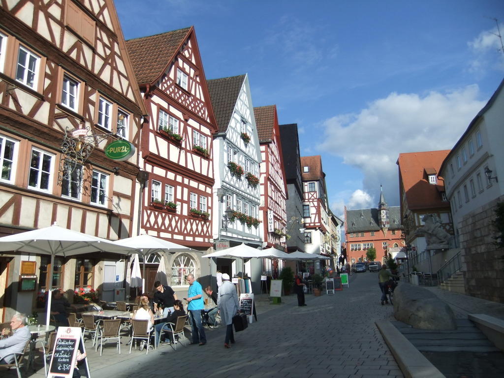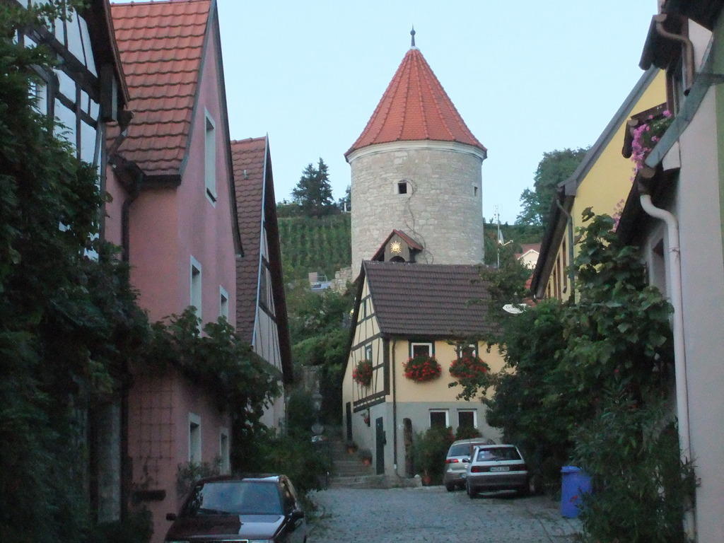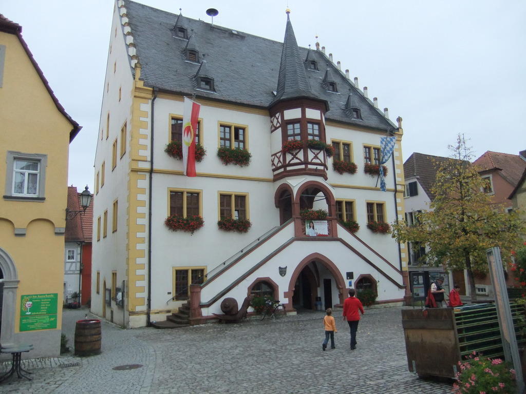 Mainradweg 1Bayreuth - WürzburgTag 6: Wipfeld - Sommerhausen - 13.09.2010Mainschleife... In diesem großen, hellen Zimmer hatten wir sehr gut geschlafen. Wie erwartet war das Frühstück ebenfalls hervorragend. Wir ließen uns Zeit. Gegen 10 Uhr ging es zunächst mit einer kleinen Schiffstour los. Wir setzten mit der Fähre auf die andere Mainseite über. In der Nacht hatte es geregnet, jetzt war es aber wieder trocken. Der erste Ort, an dem wir vorbei fuhren war Stammheim. Außer einigen alten Flugzeugen, die vor einem Museum standen, haben wir dort nichts ungewöhnliches gesehen. Die schweren Jungs wohnen anscheinend woanders. Danach ging es nach Volkach. Eine knappe Stunde schauten wir uns den netten Stadtkern an, bevor es dann weiter nach Schwarzach ging. Eine riesige Klosteranlage war schon von weitem zu sehen. Die Kirche war leider verschloßen. Wir hätten sie gerne von innen angeschaut. Zu dem Benediktinerkloster gehört unter anderem eine Jungenschule. Nach kurzer Pause fuhren wir weiter bis Kitzingen. Hier machten wir eine Kaffee und Kuchenpause. Dann folgten wir weiter dem Mainradweg auf dem südlichen Ufer. Auf unserer gesamten Radtour standen am Wegesrand oft Obstbäume. Ein paar Äpfel probierten wir, aber die meisten waren noch nicht ganz reif. Ab Schweinfurt befanden wir uns in einem Weinanbaugebiet. Die Trauben waren jetzt reif und die Weinlese war in Gange. In Marktbreit machten wir einen kurzen Schlenker in den Ort hinein. Auch dieser historische Ort mit seinen prächtigen Bürgerhäusern war den Abstecher wert. Wenig später erreichten wir den südlichsten Abschnitt unserer Tour: Ochsenfurt. Hier schoben wir unsere Räder durch die Fußgängerzone, am dreigeschoßigen spätgotischen Rathaus vorbei, zur Touristeninformation. Diese Stadt machte auf uns einen freundlichen Eindruck. Während unserer ganzen Reise war Fachwerk das vorherrschende Element der Stadtkerne. Konny fragte bei der Touristeninformation nach einem Zimmer für zwei arme müde Radlerinnen. Der nette Mann dort sagte: „da hab ich genau das Richtige für sie, wenn sie es schaffen, noch fünf Kilometer weiter zu fahren.” Das war kein Problem für uns. Wir setzten nochmals mit einer Fähre über und waren eine halbe Stunde später in Sommerhausen. In einer netten Privatpension wurden wir freundlich empfangen und bummelten wenig später durch das Örtchen. Das war wieder mal ein Geheimtipp. Der Ort ist von einer Stadtmauer umgeben. Dort leben viele Künstler und außerdem befindet sich hier das kleinste Theater Deutschlands. Es gab zudem auch mehrere Restaurants und Weinstuben, von denen aber, da Montag war, einige geschloßen hatten. In einem Restaurant herrschte dagegen Hochbetrieb und die Leute standen Schlange. Wir drehten eine zweite Runde durch den Ort. Nachdem eine Busgesellschaft das Lokal verlassen hatte, fanden wir Platz und es gab ein leckeres Eßen und guten Wein. Etwas weinseelig gingen wir später zu unserer Pension zurück.