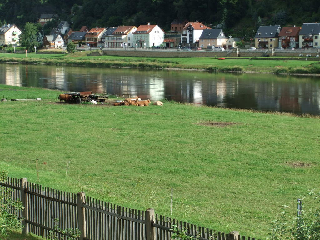 Deutschland Ost-WestZittau - AachenTag 3: Bad Schandau - Dresden - 12.07.2012Elberadweg... Obwohl eine Bahnlinie direkt am Haus entlanglief, hatte ich die Nacht geschlafen wie ein Stein. Ich war zwar einige Male aufgewacht, aber gleich wieder eingeschlafen. Das Frühstück war prima und ich durfte mir noch ein paar Brötchen für unterwegs mitnehmen. Meine Gastgeber sind wirklich nette Leute. Um 9.15 Uhr ging es los. Der Himmel war wieder mit reichlich vielen Wolken bestückt. Oft schaute dazwischen aber auch die Sonne hervor. Der Weg an der Elbe entlang war wieder traumhaft. Diesmal fuhr ich auf der linken Elbeseite. Die Cross-Strecke von vor vier Jahren war mir noch in lebhafter Erinnerung. Ich war bereits zum dritten Mal in dieser Gegend, aber trotzdem war ich vom Anblick der Feste Königstein und der Bastei überwältigt. Das Wetter hatte etwas von Aprilwetter. Es gab immer wieder kurze Schauern und der Wind blies dazu kräftig von vorne. Obwohl es keine nennenswerten Steigungen gab, mußte ich doch kräftig in die Pedale treten. Es waren viele Radler unterwegs. Der Elberadweg zählt ja auch zu den beliebtesten Flußradwegen Deutschlands. In Dresden machte ich heute Schluß mit dem Radfahren. So hatte ich Gelegenheit, mir die Stadt noch mal anzuschauen. An der Frauenkirche erklärten mir zwei freundliche Rikschafahrer den Weg zur Jugendherberge. Um 14.30 Uhr traf ich dort ein und bekam ein nettes Zweibettzimmer. Nach dem Duschen ging es dann zu Fuß in die Stadt. Es kam aber ein kräftiges Gewitter auf. Kein Cafe war in der Nähe. Obwohl ich keine neue Küche kaufen wollte, bat ich um Asyl in einem exklusiven Küchenstudio. Nach einer halben Stunde hörten Blitz und Donner auf und ich schaffte es bis zur Altstadtgalerie. Nach einer großen Tasse Kaffe ging es dann bei Nieselregen weiter, am Zwinger entlang, am Schloß und am Fürstenzug vorbei bis zur Frauenkirche. Sie ist immer noch beeindruckend, aber beim ersten Besuch empfand ich sie noch einmaliger. Viel Spaß machte der Stadtbummel bei diesem Wetter nicht und so ging ich frühzeitig zurück zur DJH.