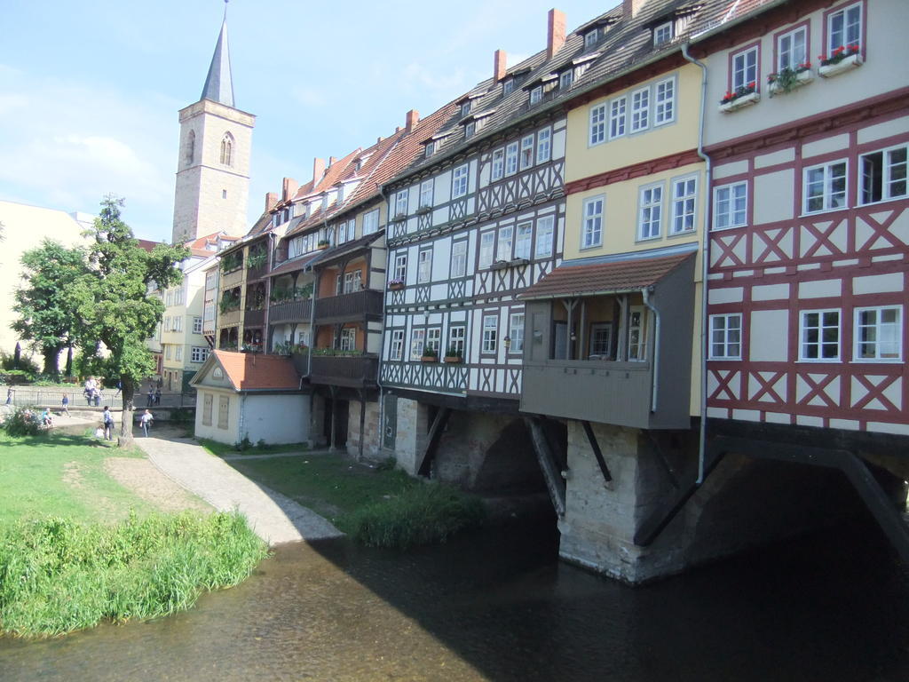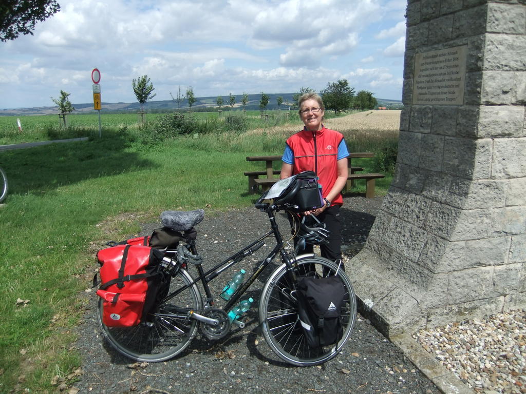 Deutschland Ost-WestZittau - AachenTag 7: Lobeda - Molsdorf - 16.07.2012Thüringer Städekette... Etwa gegen 9 Uhr ging es wie üblich los. Wenn ich der Beschreibung des Wirts gefolgt wäre, um zur Innenstadt von Jena zu gelangen, hätte ich mein Rad über eine Fußgängerbrücke schleppen müßen. Ich erinnerte mich aber daran, daß ich am Abend durch einen Fußgängertunnel gefahren war. Den fand ich auch schnell wieder und schon befand ich mich auf dem Radweg: "Thüringer Städtekette". Jena wirkte auf mich lebendig und modern. Viele junge Leute bevölkerten die Innenstadt und ließen erkennen, daß Jena eine Universitätsstadt ist. Ich fuhr an den Optischen Werken vorbei, die für die Stadt eine herausragende Bedeutung besitzen. Der Weg war gut ausgeschildert. Nach einigen Kilometern an der B 7 entlang, führte er über einen geschotterten Waldweg. Später verlief ein geteerter Weg neben einer Bahnlinie bis Weimar. Bevor ich in die Innenstadt gelangte, durchfuhr ich den Park an der Ilm. Seine Entstehung ist eng mit Goethes Leben und Wirken in Weimar verbunden. Er entstand in der Zeit zwischen 1778 und 1828. Ich kam am römischen Haus und auch an Goethes Gartenhaus vorbei. Zu einer Besichtigung hatte ich aber keine rechte Lust. Über die Sternbrücke gelangte ich zum Stadtschloß. Es ging dann weiter zum Marktplatz. Ich machte zu Fuß, mein Rad schiebend, einen kleinen Stadtrundgang. Was mir besonders gefiel, war ein Streichorchester, das aus einer Grundschulklasse bestand, die in der Fußgängerzone den Passanten ihr Können vorführte. Die kleinen Künstler waren hoch motiviert bei der Sache. Mein Weg führte dann an Goethe und Schiller vorbei, die versteinert auf die Menschen des 20. Jahrhunderts herunterblickten. Ich verließ die Stadt und machte in einem kleinen Gasthaus in Tröbsdorf eine kurze Mittagspause. Nach Kaffee und Gulaschsuppe ging es gestärkt in Richtung Erfurt. Unterwegs begleitete mich eine ganze Weile ein fitter 74jähriger Radler aus Weimar, der auf Nachmittagsrunde unterwegs war. Wegen einer Baustelle wurde der Weg umgeleitet, da half mir seine Ortskenntnis weiter. Am frühen Nachmittag erreichte ich Erfurt. Eigentlich hatte ich vor, in der dortigen JH zu übernachten. Ich hatte bereits morgens dort angerufen und sollte mich am Nachmittag noch mal melden, falls evtl. jemand abgesagt hätte, aber leider war das nicht der Fall. In der Innenstadt wuselte es nur so vor Menschen. Irgendein kulturelles Großereignis fand zur Zeit statt. Vor einigen Jahren war ich schon einmal in Erfurt. Damals konnte man sich die Stadt in Ruhe ansehen, jetzt war es unmöglich. Eine Unterkunft zu bekommen war ebenfalls aussichtslos. Somit ging es nach einer Weile auf dem Radweg weiter. Ich hielt die Augen auf, um ja kein Schild: Pension oder Gasthof zu übersehen. Es war nichts zu finden. Ich fragte verschiedene Passanten, aber erst in Bischleben gab es eine Pension. Leider war die ausgebucht, aber der Vermieter gab mir den Tipp, es in Molsdorf zu versuchen. Der Gasthof hatte zwar Ruhetag, aber trotzdem bekam ich das letzte Zimmer. Heute hatte es zum ersten Mal nicht geregnet, dafür war es aber wieder recht windig. Die Steigungen waren erträglich, oder ich hatte mich mittlerweile ans Hochfahren gewöhnt. Für Juli war es aber entschieden zu kalt.