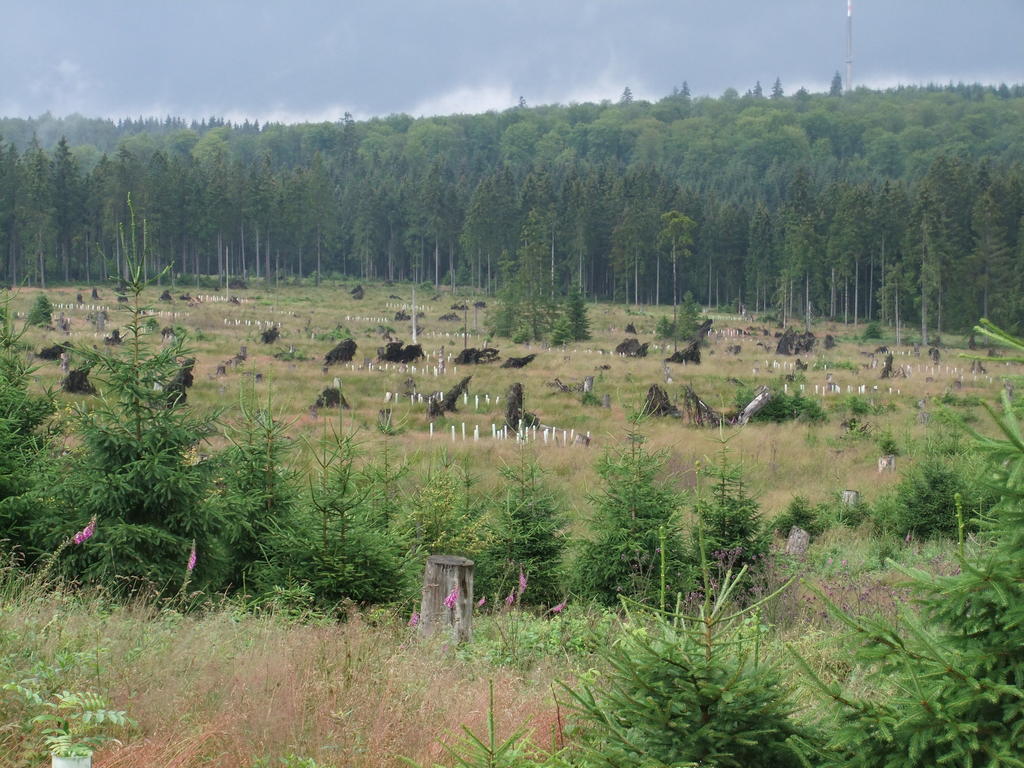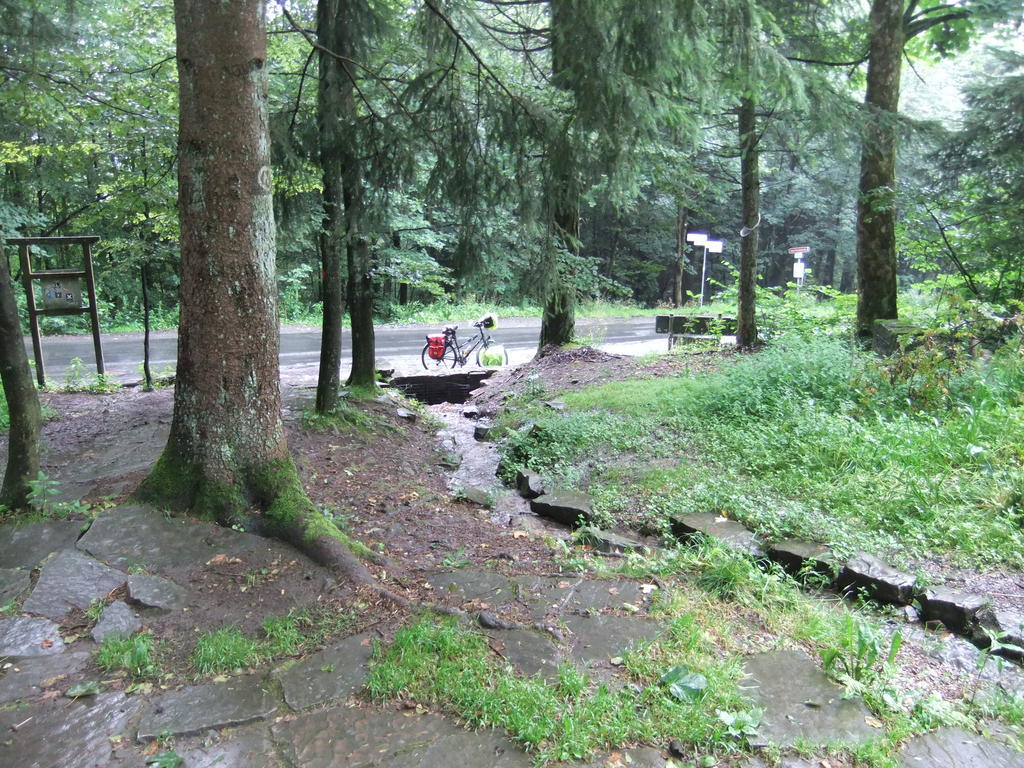 Deutschland Ost-WestZittau - AachenTag 11: Cölbe - Siegen Truppach - 20.07.2012Couchsurfing... In dieser Nacht hatte ich sehr schlecht geschlafen, da halbstündlich eine Bahn am Haus entlang fuhr. Deshalb stand ich schon um 7 Uhr auf und saß eine Stunde später bereits auf dem Rad. Zunächst lief es überraschend gut. Zum ersten Mal auf der Tour hatte ich keinen Gegenwind und es war flach. Nur der Regen blieb mir mal mehr, mal weniger, erhalten. Um 10 Uhr war ich in Biedenkopf und schon um 11Uhr in Bad Laasphe. Hier legte ich erst mal eine gemütliche Pause ein und erkundigte mich in der Touristeninformation nach dem besten Weg nach Siegen. Mit dem Gedanken, am frühen Nachmittag in Siegen zu sein, ging es weiter. Ich fuhr den D 4 Weg weiter bis Banfe. Im Ort mußte ich den Abzweig in Richtung Lahnquelle etwas suchen. Freudingen war ausgeschildert, aber das war die falsche Richtung. Ein freundlicher Dorfbewohner erklärte mir, daß der Weg richtig sei und er sich später teilen würde. Ich müsse nur noch erst einen Berg hinauf. Die Straße sei aber in schlechtem Zustand, womit er absolut recht hatte. Stundenlang quälte ich mich zur Lahnquelle hoch, meistens schiebend. Wenn es zwischendurch mal ein kurzes Stück bergab ging, konnte ich aber auf Grund der miserablen und nassen Straße, mein Rad nur mit angezogenen Bremsen rollen lassen. An der Lahnquelle kam es dann zum Frustessen in Form eines leckeren Stück Apfelkuchens mit Kakao. Die Bedienung erklärte mir auf meine Frage nach dem Weg nach Netphen, ich müsse nur noch ca. drei Kilometer geradeaus bis zur Siegquelle, dann zur Ederquelle, dann hinunter an der Obernautalsperre vorbei und schon wäre ich in Netphen. Es klang ganz einfach. Die schnurgerade Straße zur Siegquelle war zwar nicht mehr ganz so steil, wie der Weg vorher, aber trotzdem mußte ich ab und zu schieben. Hier oben, auf der Eisenstraße konnte man noch deutlich die Schäden, die der Sturm Kyrill vor fünf Jahren hinterlassen hatte, erkennen. An der Siegquelle wurden ein paar Fotos geschossen und wenige Meter weiter war auch schon die Ederquelle. Dann ging es, so schnell die schlechte Straße es erlaubte, den Berg hinab. Unten angekommen, als ich das Schild: Lützel las, kam das böse Erwachen. Ich war zu weit geradeaus gefahren. Ich hätte heulen können. Einige Male fuhr ich die Straße auf und ab, aber nirgends entdeckte ich eine Möglichkeit, ohne großen Umweg, oder ohne den Berg wieder hinauf zu müssen, nach Siegen zu gelangen. Ein freundlicher Mann erklärte mir dann einen ziemlich direkten Weg nach Netphen. Das war der absolut schwierigste und steilste Weg, den ich jemals im Leben mit einem Fahrrad bewältigt hatte. An fahren war nicht zu denken, aber Hauptsache, ich kam heil unten an. Ich mußte beide Bremsen ziehen und mich gegen mein Rad stemmen, um auf den steilen und rutschigen Waldweg, der mit großen Steinbrocken übersäht war, heil ins Tal zu kommen. Trotzdem war ich froh, daß ich diesen Weg gefunden hatte. Nach 20 Minuten Kraftanstrengung und der Befürchtung: "wenn ich mir hier die Füße verknackse und ich liegen bleibe, findet mich niemand", hatte ich es geschafft. Das war noch mal gut gegangen! Nun ging es von Afholdersbach weiter bis Netphen und auf der Bundesstraße in Richtung Siegen. Ab der Universität war die Straße für Radfahrer verboten. Ohne nennenswerte Umwege gelangte ich dann kurz darauf zur Innenstadt. Hier traf ich nach einem kurzen Telefonat Uta, eine "alte" Bekannte, die ich schon einige Jahre nicht mehr gesehen hatte. Die Wiedersehensfreude war groß. Wir tranken in einem Straßencafe erst mal ein Bier. Eine nette Nachbarin kam wenig später hinzu. Es gab viel zu erzählen. Nach einer Weile fuhren die beiden mit dem Bus zur Wohnung und ich kam mit dem Rad nach. Nachdem ich mich frisch gemacht hatte, ging es mit Uta zu einer netten Dorfgaststätte in der Nachbarschaft. Dort verbrachten wir einen lustigen und geselligen Abend gemeinsam mit einigen netten Freunden von ihr.