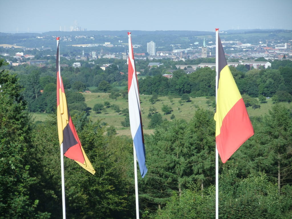Deutschland Ost-WestZittau - AachenTag 14: Neubottenbroich - Aachen - Kerkrade - 23.07.2012Geschafft... Der Tag fing erst mal mit einem gemütlichen Frühstück an. Danach suchte Lupo mir am PC die günstigste Route zum Drei-Länder-Eck aus und gab mir noch eine passende Radkarte dazu. Gegen 10 Uhr ging es los. Heute war es richtig schön, so wie Sommer sein soll. Es ging über ruhige Wege Richtung Kerpen, dann Richtung Buir. Wegen des Braukohletagebaus waren manche Straßen verlegt worden, oder gab es einfach nicht mehr. Ich mußte mir den Weg suchen. Selbst die Einheimischen kannten sich in ihrer Heimat nicht mehr so recht aus. Es ist bedrückend, wenn nach und nach Dörfer und Städte einfach verschwinden. Ich fuhr über Arnoldsweiler, Langerwehe und Eschweiler bis Stolberg. Dabei überquerte ich ein im Bau befindliches Stück der neuen A 3 und eine neue Bahntraße. Selbst Autobahnkreuze wurden versetzt. Im Hintergrund konnte ich die riesigen Abraumhalden und teilweise sogar die Braunkohlebagger erkennen. Im Vordergrund lief unterdessen die Getreideernte. Ein Bild, das irgendwie nicht zusammen passte. Von Stolberg aus ging es dann rasant hinunter ins Aachener Stadtzentrum. Hier herrschte Trubel und Menschengewimmel. Das schöne Wetter lockte die Menschen ins Freie. Als erstes fotografierte ich das erste Ortschild von Aachen. Dann ging es zum Dom. Dort gönnte ich mir zur Feier des Tages einen dicken Eisbecher. Anschließend erkundigte ich mich bei der Touristeninformation nach dem Weg zum Dreiländereck. Es ging in Richtung Vaals und danach einen sehr steilen Berg hinauf bis zu einem Aussichtsturm. Dort rief ich meinen Bruder an, der schon mehrfach nachgefragt hatte, wann ich in etwa dort ankommen würde. Er fragte, ob meine Schwägerin dort sei. Nein, sie war weit und breit nicht zu sehen. Nach einigen Handyanrufen stellte sich heraus, daß es zwei Aussichttürme gibt und sie an dem anderen auf mich wartete. Jetzt wollte ich aber erst mal mein Ziel von oben sehen. Weil meine Beine doch etwas müde waren, fuhr ich mit dem Aufzug auf den Turm. Von hier oben hatte ich eine tolle Aussicht auf Holland, Belgien und Deutschland. Ich hatte es geschafft und war in nicht ganz zwei Wochen komplett durch die Mitte Deutschlands gefahren. Ich war stolz und glücklich, daß ich auch diesmal unbeschadet mein Ziel erreicht hatte. Diese Tour war wesentlich anstrengender als durch die Länge Deutschlands zu fahren. Das hatte ich vorher gewußt, doch es war auch eine Herausforderung, zu versuchen auch diese Strecke mit ihren vielen Höhenmetern zu schaffen. Auf Grund des vielen schlechten Wetters konnte ich erst an den letzten Tagen die Tour richtig genießen. Bei Regen und Wind macht es keinen Spaß, sich irgendwo auf einer Bank zu setzten und die Gegend zu genießen. Dann will man nur schnell durchkommen und sein Tagesziel erreichen. Wenig später kam Silvia. Es war riesig nett, daß sie mich hier, am Ziel meiner Tour, empfangen wollte. Wir tranken ein Glas Apfelschorle und fuhren dann wenige hundert Meter zum zweiten Aussichtsturm. Hier wurden noch mal ein paar Erinnerungsfotos gemacht. Ich war in jedem Fall am Drei Länder Eck angekommen. An beiden Türmen stand ein entsprechendes Schild. Danach nahm Silvia mein Gepäck im Auto mit und ich fuhr "erleichtert" nach Kerkrade. Es ging noch mal zurück nach Aachen, an der Uniklinik vorbei, über Laurentsberg, Richterich, Horbach bis zur Speckholzerheide. Es wurde ein schöner Abend, denn ich war rechtzeitig zum Geburtstag meines Bruders hier angekommen.