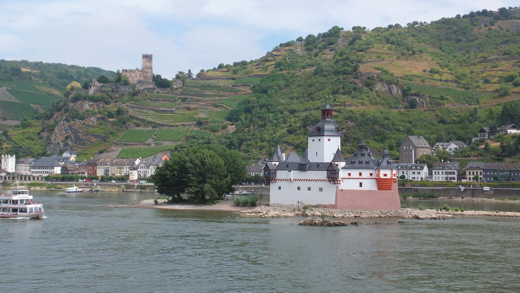 MittelrheinradwegMainz - DüsseldorfTag 2: Geisenheim - Spay - 07.08.2013Darum ist es am Rhein so schön... n der Nacht hatte es kräftig geregnet. Es war, wie es sich später herausstellte, schon der gesamte für den Tag gemeldete Regen. So herum war es uns natürlich am liebsten. Gegen 9.50 Uhr ging es los. Wir hatten beide recht gut geschlafen, gut gefrühstückt und fühlten uns dementsprechend fit. Einmal durch den Ort und schon waren wir wieder auf dem Rheinradweg. Es war etwas trüb, aber warm genug für kurze Hosen. Kurze Zeit später erreichten wir Rüdesheim. Hier herrschte schon am Morgen reichlich Rummel. Die berühmte Drosselgasse und das Niederwalddenkmal ziehen schon seit Jahrzehnten Busladungen voller Touristen an. Nun setzten wir mit der Fähre auf die andere Rheinseite nach Bingen über. Wie empfohlen fuhren wir nun linksrheinisch weiter. Der Radweg war gut gekennzeichnet und gut ausgebaut. Überwiegend war er asphaltiert und verlief in Sichtweite des Rheins. Unzählige Burgruinen entlang des Flusses boten reichlich Fotomotive. Die früheren Burgherren hatten sich herausragende Stellen ausgesucht. Wir fuhren an bekannten Orten wie Bacharach und Oberwesel vorbei und machten in Sichtweite der Loreley eine gemütliche Mittagspause. Der Rheinradweg ist beliebt; viele Radler tummelten sich in beiden Richtungen auf dem Weg. Wir hatten heute Glück mit dem Wind, er schob uns, Berge waren auch nicht zu erklimmen und so kamen wir gut voran. Es ging weiter über St. Goar, Bad Salzig bis Boppard. Nun versuchten wir telefonisch für die Nacht ein Zimmer zu ordern, leider erfolglos. In Boppard selbst war uns der Touristenrummel zu groß und die Preise zu hoch. In der Touristeninformation konnte man uns nicht weiterhelfen, da wir nicht im Ort bleiben wollten, sondern noch etwas weiter rheinabwärts fahren wollten. So weit ging aber das Einzugsgebiet der Touristeninformation nicht. Im nächsten Ort wurden wir fündig. In einem Gasthof bekamen wir ein schönes Zimmer mit Rheinblick. Unser Abendessen nahmen wir auf der Terrasse ein. Wir saßen lange draußen und beobachteten die Schiffe und auf dem gegenüberliegenden Ufer die vorbeifahrenden Züge. Wir genossen den schönen Abend und ließen den Tag revue passieren.