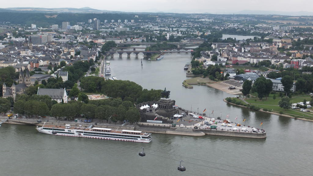 MittelrheinradwegMainz - DüsseldorfTag 3: Spay - Koblenz - 08.08.2013Auf der Festung... Kurz vor 10 Uhr ging es nach einem reichhaltigen Frühstück los. Der Himmel war weniger bewölkt als am gestrigen Tag, doch die Sonne wollte sich nicht so recht blicken lassen. Zum Radfahren war die Temperatur aber durchaus gut. Heute hatten wir leichten Gegenwind und eine Holperstrecke auf altem Kopfsteinpflaster bremste unseren Vorwärtsdrang. Wir machten eine kurze Pause, als wir das gegenüberliegende Ufer von Lahnstein erreichten. Nun stand ich an der Stelle, die ich vor kurzem von der anderen Rheinseite her gesehen hatte, als ich mit Hildegard die Lahnmündung erreicht hatte. Wenig später waren wir in Koblenz. Wir fuhren durch eine Allee am Rheinufer entlang, an der schöne alten Villen standen. Die Gegend um das Deutsche Eck war vor zwei Jahren, anlässlich der Bundesgartenschau neu hergerichtet worden. An der Seilbahnstation wollten wir unsere Räder abstellen und das Gepäck im Schließfach einschließen. Leider bestand keine Möglichkeit das Gepäck unterzustellen. Das ist verwunderlich, zumal viele Leute mit dem Rad unterwegs sind. Bei der Bundesgartenschau soll es hier Gepäckfächer gegeben haben. Wir wurden an die Bahnhofsschließfächer verwiesen. Leicht verärgert machten wir uns auf den Weg zum Hauptbahnhof. Nach einigen hundert Metern hielten wir an einer Straßenkreuzung um uns zu orientieren Dort wurden wir von einem Mann angesprochen. Als er hörte, weshalb wir zum Bahnhof wollten, bot er spontan an, die Räder mit Gepäck bei ihm unterzustellen. Das war riesig nett und wir nahmen sein Angebot an. Er war selber Radfahrer und kannte die Problematik. Auch er verstand nicht weshalb die Gepäckaufbewahrung an der Seilbahnstation nicht mehr existierte. Nun konnten wir beruhigt mit der Seilbahn zur Festung Ehrenbreitstein hinauffahren. Sie thront 118 Meter über dem Rhein. Von dort hat man einen tollen Blick auf das Deutsche Eck, den Zusammenfluß von Rhein und Mosel. Auch die Fahrt hinauf über den Rhein war wieder ein Erlebnis. Leider war oben auf dem Berg nur noch wenig von der Blumenpracht der Bundesgartenschau übrig geblieben. Wir wollten aber in erster Linie die Festung erkunden. Das ist aber an einem halben Tag unmöglich. Die Anlage ist so weitläufig und verschachtelt, daß wir nur einen groben Überblick erhielten. Seit rund 5000 Jahren ist die Gebirgsnase besiedelt und wurde von den verschiedenen Bewohnern immer weiter ausgebaut und vergrößert. Verschiedene Ausstellungen und eine Multimedia-Inszenierung gaben uns einen Einblick in den Aufbau und die Geschichte der Anlage. Der Plan zur Erbauung als Festung stammt vom Preußenkönig Friedrich III Anfang des 1800 Jahrhunderts. 1500 Mann und 80 Geschütze betrug die volle Gefechtsstärke. Moderne Kriegsführung und Waffentechniken verdammten die Festung schon bald nach ihrer Fertigstellung zu strategischer Bedeutungslosigkeit. Die Anlage wurde zum Glück nie zerstört und ist heute ein Ort friedlicher Begegnung für Menschen aus aller Welt. Hier oben gibt es zudem auch eine Jugendherberge, die wir aber nicht in Anspruch nehmen wollten, da wir eine Einladung zum Übernachten hatten. Kurz nach 15 Uhr waren wir wieder an unseren Rädern. Dann fuhren wir ein kurzes Stück am Moselufer entlang zu Klaus’ Freund Mecki. Bei einem Stück Kuchen gab es Einiges zu erzählen. Gegen 18Uhr machten wir uns zu dritt auf in die Stadt. Bei einem Inder gab es was Gutes für das leibliche Wohl. Danach machten wir, angeführt von Mecki noch eine kleine Stadtrundfahrt mit unseren Rädern. Anschließend fuhren wir ein zweites Mal hinauf zur Festung Ehrenbreitstein. Regelmäßig finden dort kulturelle Veranstaltungen und Konzerte mit unterschiedlichen Interpreten statt, die Mecki auch nach Möglichkeit besucht. Heute gab es ein Konzert der Simon & Garfunkel Revival-Band. Menschenmassen strömten zusammen. Auf einem großen Innenhof vor der Bühne standen die Leute dicht an dicht. Es war kein durchkommen. Zudem war die Musik seltsamerweise so leise, daß man kaum etwas hören konnte; vom Sehen ganz zu schweigen. Wir versuchten einen besseren Standort zu ergattern, gaben es aber nach kurzer Zeit auf. Stattdessen gingen wir auf den großen Platz außerhalb des Konzertgeländes. Von dort hatten wir einen schönen Ausblick auf Koblenz. Auch hier mussten die Leute anstehen, hier allerdings um an Getränke zu kommen. Wir drei unterhielten uns angeregt und genossen die schöne Atmosphäre und den Ausblick. Der Sonnenuntergang und die Lichter der Stadt waren es wert hier hinauf gefahren zu sein. Erst sehr spät, nach einem Absacker legten wir uns auf Meckis Besuchercouch.