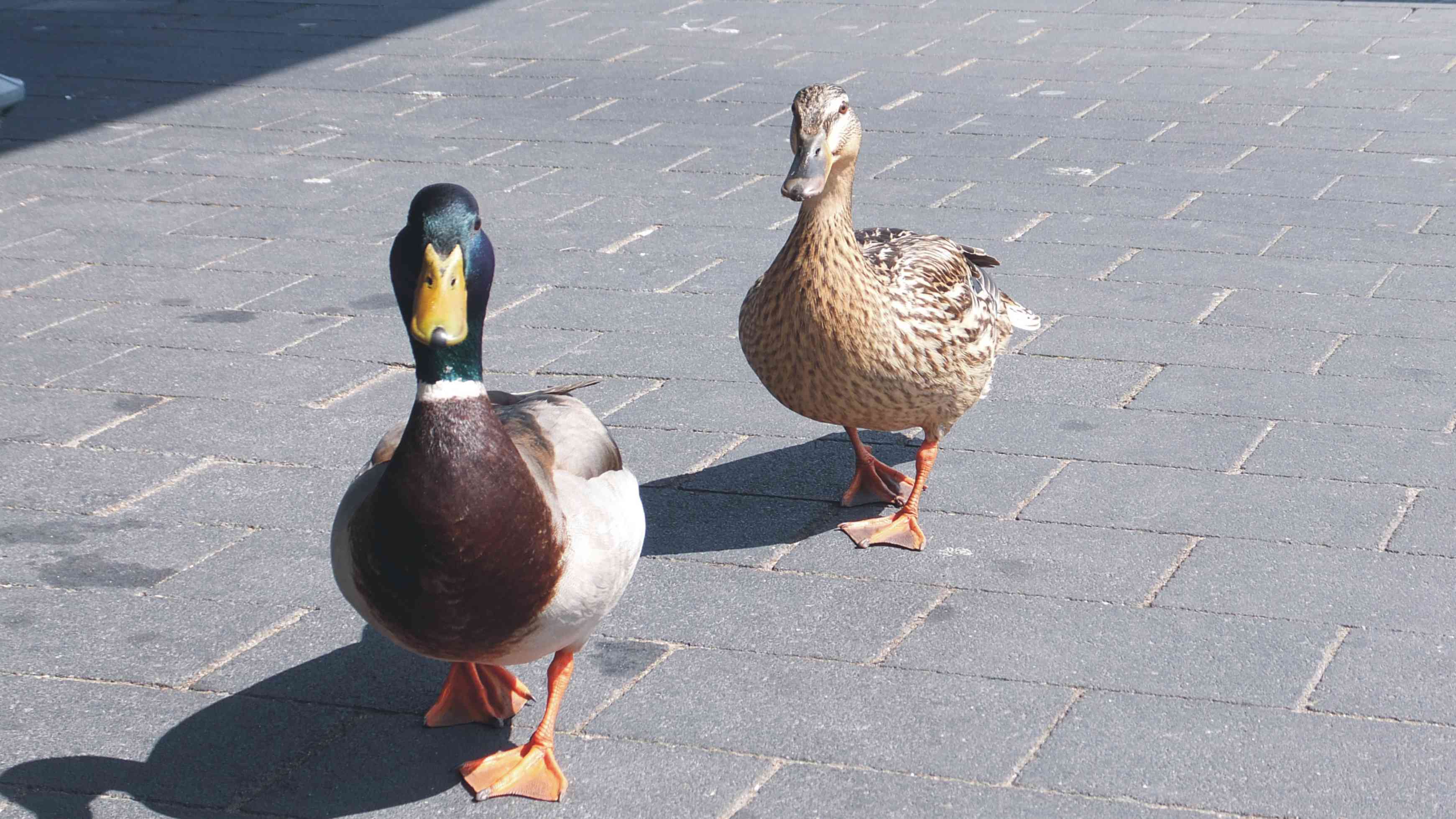 Kurz vor dem Zentrum von Miltenberg besorgten wir uns Getränkevorräte. Vor dem Supermarkt stand ein Entenpaar, das ebenfalls einkaufen wollte. Da sie kein Geld dabei hatten, warteten sie vor der Türe und hofften auf Almosen der Kunden. Das taten sie nach Angaben einiger Kunden täglich.