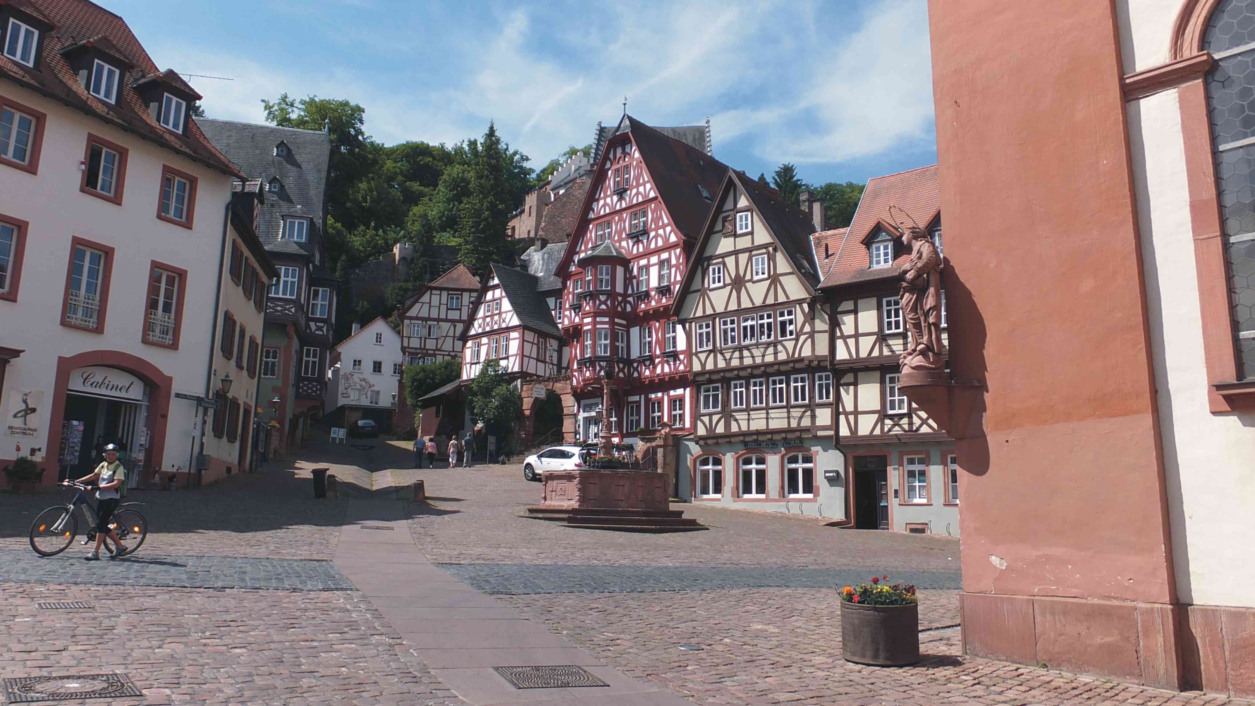 Der Anblick der Stadt Miltenberg ist beeindruckend. Die alte Fachwerkstadt liegt an einem Mainbogen. Man fährt zunächst am alten Elektrizitätswerk vorbei, dann blickt man auf die alte Mainbrücke mit ihren großen steinernen Toren. Am Mainufer liegen die Auflugsschiffe. Hoch am Hang sieht man die Miltenburg. Aufgrund von Bauarbeiten wurde der Radweg nicht an der Strandpromenade entlang, sondern durch die Stadt geführt. So sahen wir auch die Klosterkirche, und fuhren über die enge Hauptstraße entlang der schönen Fachwerkhäuser und vielen Gasthäuser.