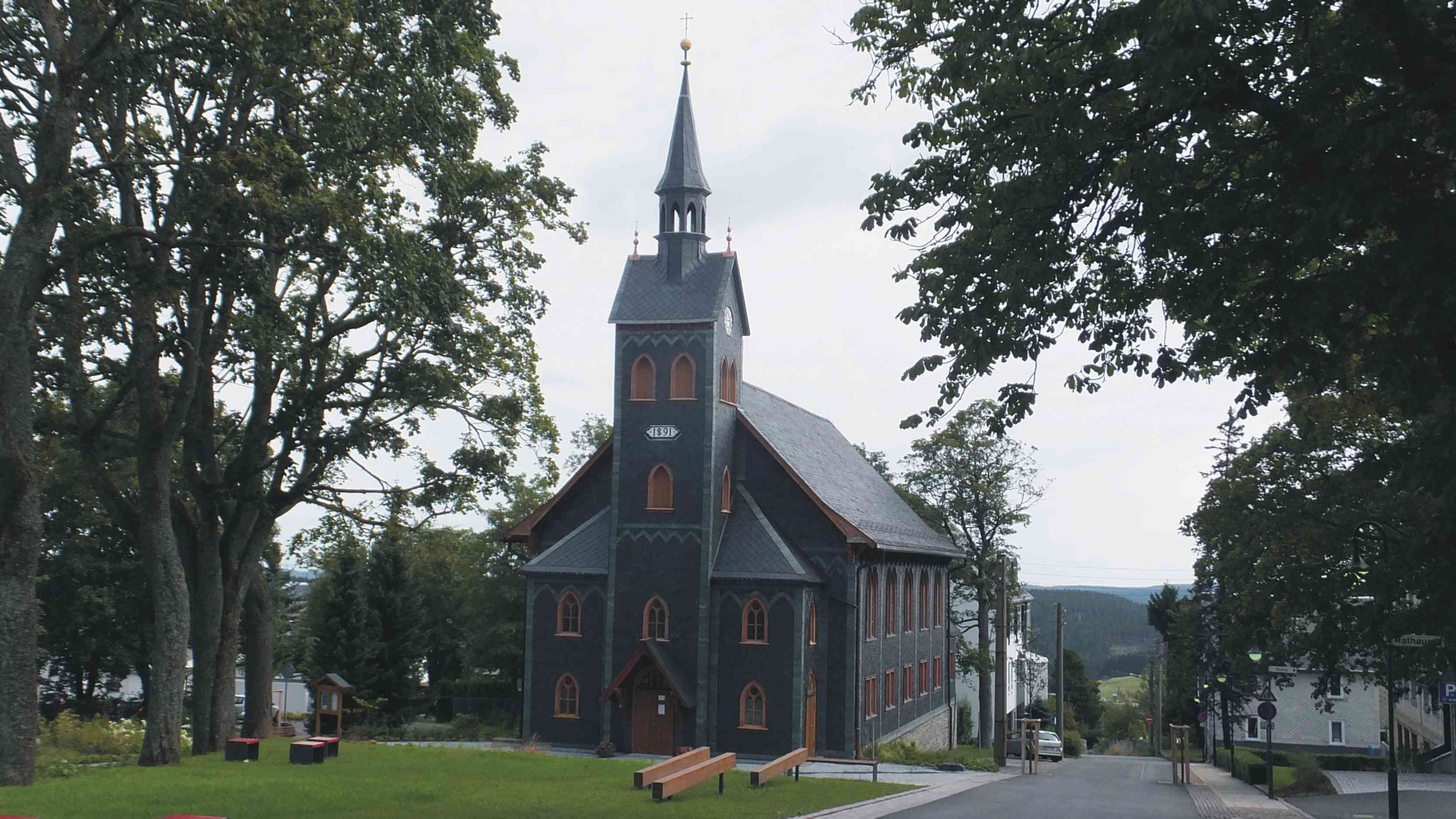 Nach dem Frühstück ging es um 10 Uhr los. Zuerst besorgten wir uns Wasser und Obst für unterwegs. Dann fuhren wir zur Stadtkirche. Sie ist eine der schönsten und größten Holzkirchen in Thüringen und komplett mit Schiefer bedeckt. Leider war sie geschlossen. Wir hätten uns zwar den Schlüssel bei der Touristeninfo besorgen können, verzichteten aber darauf.