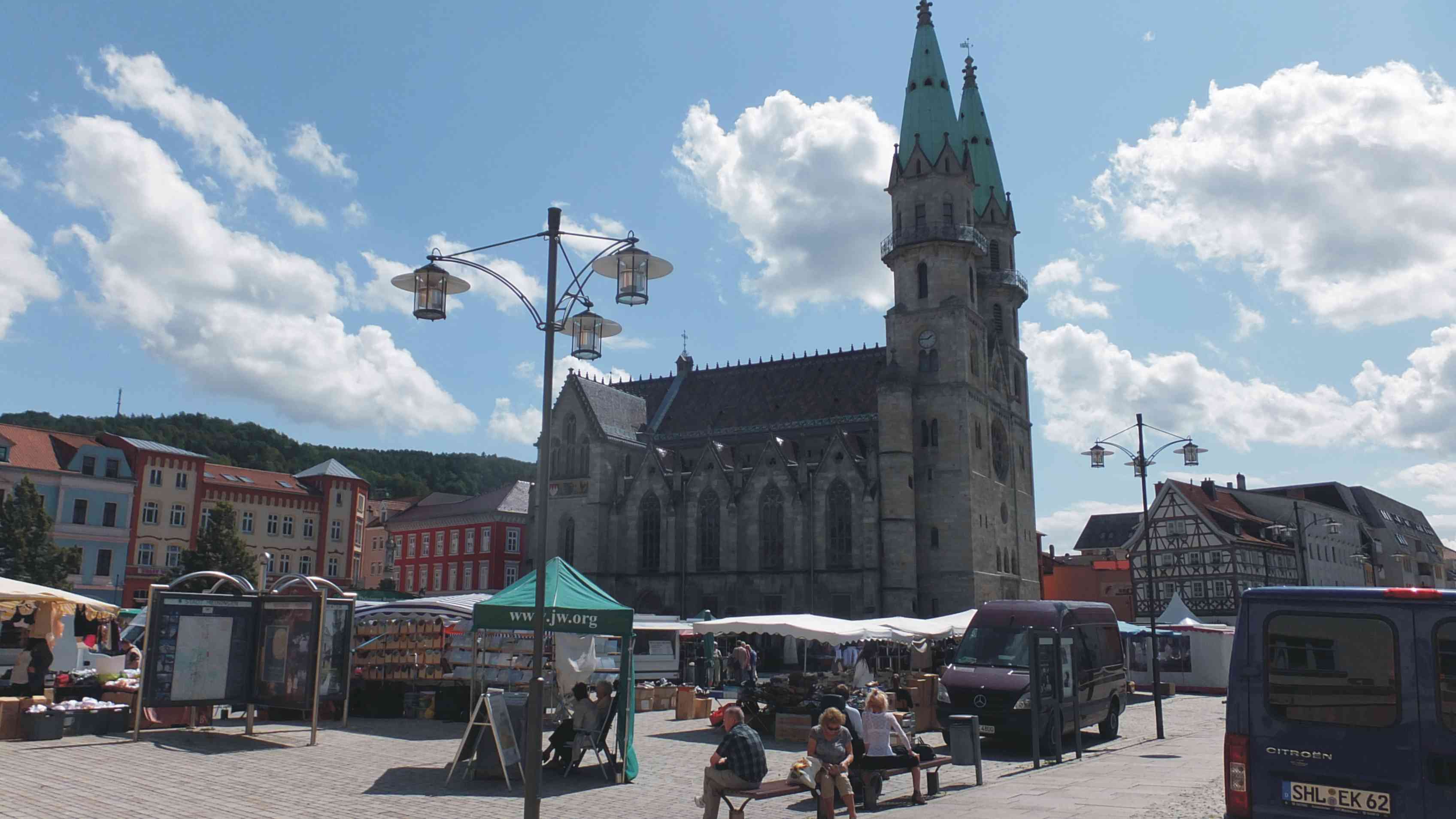 In Meiningen machten wir eine ausgiebige Pause. Wir stärkten uns am Marktplatz, Klaus mit einer original Thüringer Bratwurst und ich mit einem leckeren Käsebrötchen. Es war mittlerweile richtig heiß geworden, so daß wir froh waren, unter einem Sonnenschirm zu sitzen. Es war gerade Markttag und wir konnten gemütlich dem Treiben zusehen. Auf einen Stadtbummel verzichteten wir, da wir die Stadt bereits von früheren Besuchen kannten.
