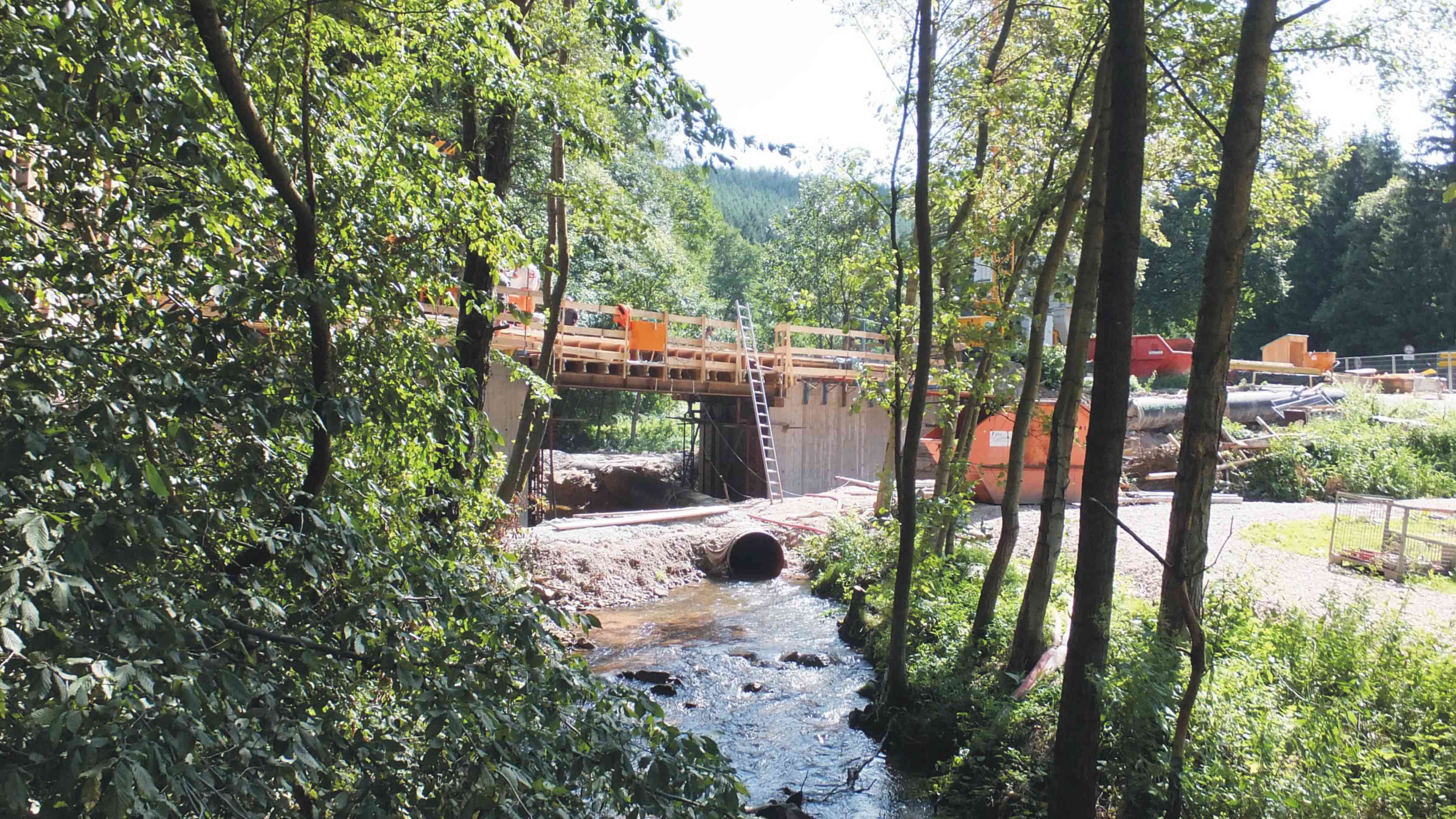 Nach der Stärkung ging es weiter über Wasungen in Richtung Schwallungen. Die Straße war für PKW gesperrt; von Radfahrern stand nichts auf den Schildern. Es ging durch ein kleines Waldgebiet, direkt an der Werra entlang. Hinter einem Anstieg, nach einer Kurve, bekamen wir einen riesigen Schrecken. Die Straße war weg! Eine Brücke über einen kleinen Bach war abgerissen worden und Bauarbeiter mit großen Baustellenfahrzeugen waren dabei, eine neue Brücke zu bauen. Zum Glück hatte man an Radfahrer und Fußgänger gedacht. Eine provisorische Holzbrücke ermöglichte es uns, den Weg fortzusetzen.