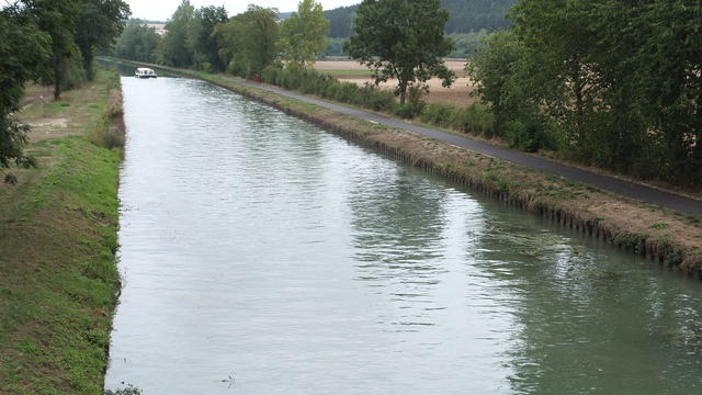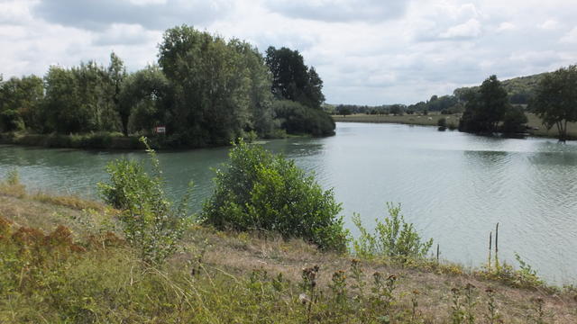 Wir hatten ja gehofft, es bliebe bei dieser einen Steigung, aber weit gefehlt. Es ging Kilometerweit rauf und runter. Die Landschaft war nun mal hügelig. Entschädigt wurden wir durch die schöne Gegend und den Blick auf den Kanal in der Ferne.