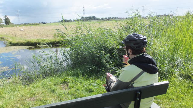 Kurz vor Monnikendam brauchten wir mal eine richtige Pause. In einem Erholungsgebiet fanden wir ein nettes Restaurant mit Blick aufs Ijsselmeer. Hier war es ruhig und idyllisch. Wir aßen einen leckeren Toast und ließen die Seele baumeln. Als wir wieder aufbrechen wollten, zogen dunkle Wolken auf. So verlagerten wir uns nach drinnen und überbrückten den Regenschauer mit einem Eis am Stiel.