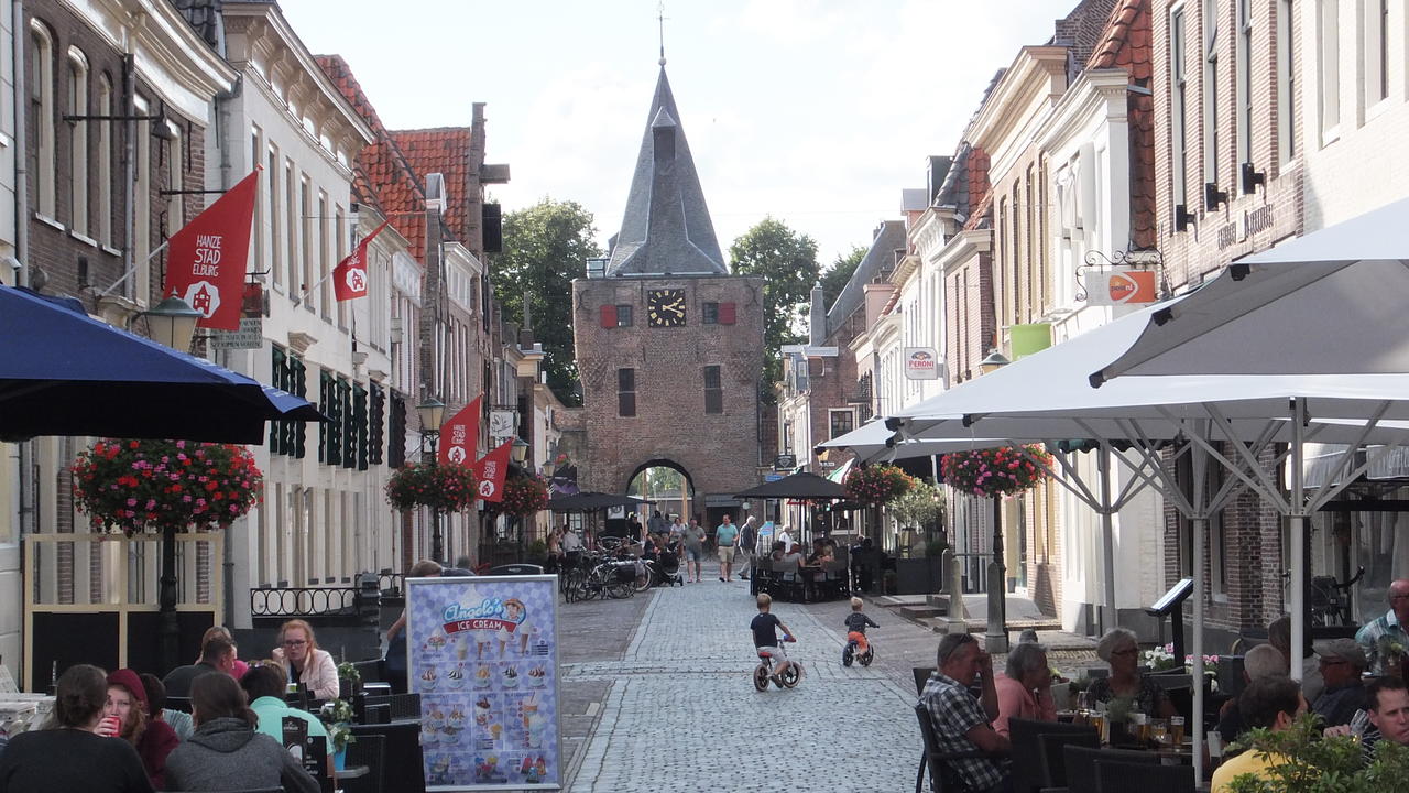 Nach dem Duschen fuhren wir zwei Kilometer zum alten Stadtkern von Elburg. Wir waren begeistert. Kleine Häuser standen entlang der alten Stadtmauer. Daß es sich um eine ehemalige Hansestadt handelt, die im Mittelalter sicher viele wohlhabende Einwohner hatte, kann man an den großen Bürgerhäusern erkennen. In der Mitte der Stadt verläuft ein kleiner Stadtgraben. Die Stadt ist nahezu rechteckig angelegt. Im Zentrum gibt es viele Restaurants. Hier herrschte an diesem schönen Sommerabend reger Betrieb. Die Menschen saßen meist draußen und genossen das gute Wetter. In einem dieser Restaurants aßen auch wir zu Abend. Es schmeckte ausgezeichnet. Gegen 21 Uhr fuhren wir zurück in unsere Unterkunft.