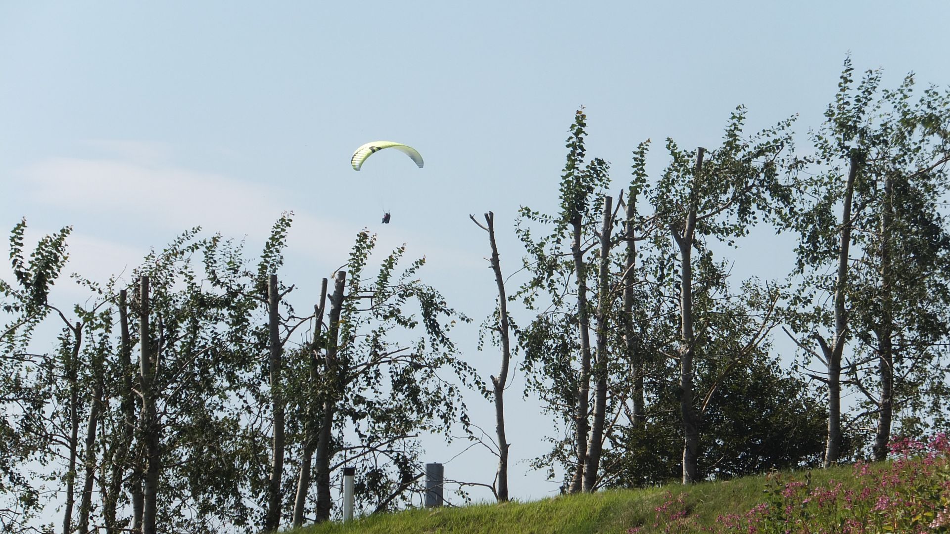 Gegen 12 Uhr erreichten wir das Ende des Sees. Unser Bus stand schon dort. Das Verladen der Räder dauerte eine Weile, da alle in der Reihenfolge, in der sie am nächsten Tag ausgeladen werden sollten, verstaut werden mußten. Während des Verladens schwebten eine Reihe Gleitschirmflieger über unsere Köpfe hinweg und landeten kurz hinter uns auf einer Wiese. Nach etwa einer Stunde waren alle Räder im Anhänger.