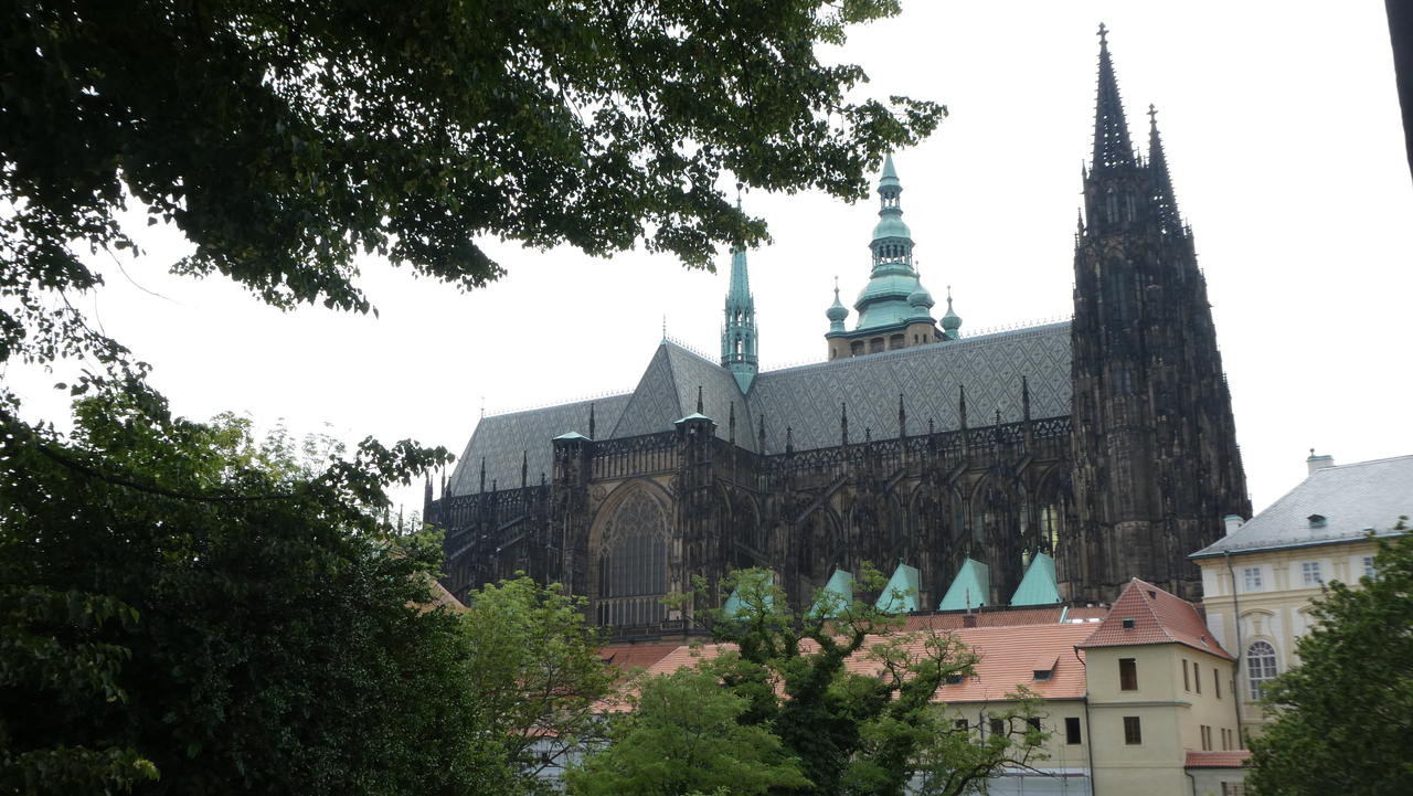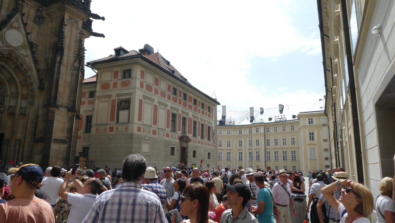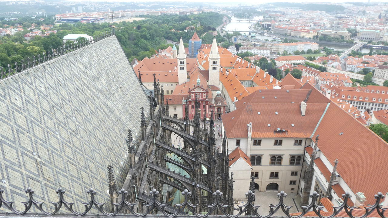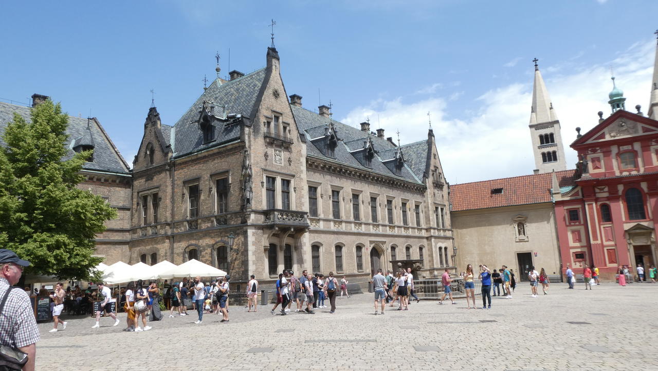 Nach einer halben Stunde waren wir am Hradschin. Wir mußten durch eine Polizeikontrolle, brauchten jedoch zunächst keinen Eintritt zu zahlen, was uns sehr verwunderte. Touristenmassen waren dort unterwegs. Um in verschiedene Gebäude zu gelangen, benötigten wir dann doch eine entsprechende Eintrittskarte. Da hieß es erstmal Schlange stehen. Nachdem wir dann die Karte in der Hand hielten, um in die Vitus-Kathedrale zu gelangen, hieß es wieder lange anstehen. Die Kathedrale war beeindruckend und zudem kühl. Draußen herrschten schon am Morgen hochsommerliche Temperaturen. Nachdem wir uns die Kirche angeschaut hatten und auf dem Innenhof standen, sah ich hoch oben auf dem großen Südturm einige Leute. Da wollte ich unbedingt auch hinauf. Also nochmal Eintritt zahlen und dann es ging die 240 Stufen nach oben. Die Mühe hat sich gelohnt. Der Blick über die ganze Stadt war unbeschreiblich. Danach machten wir erstmal Pause in einem netten Biergarten auf dem Gelände.