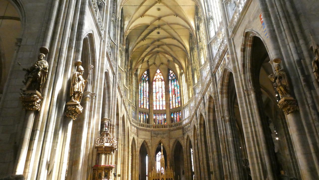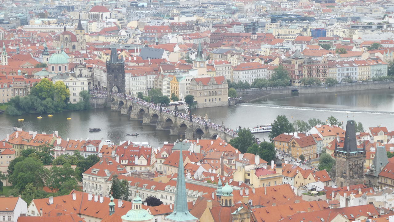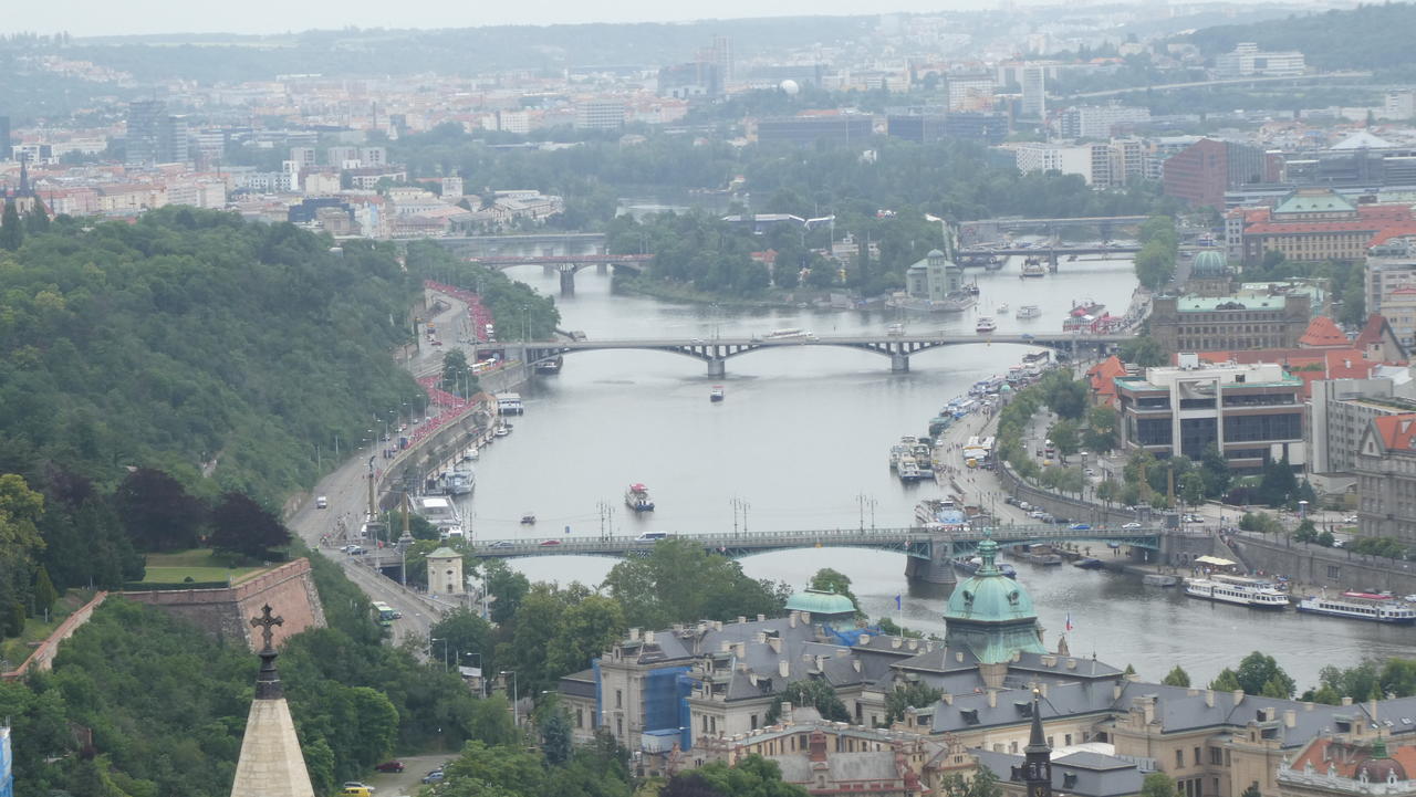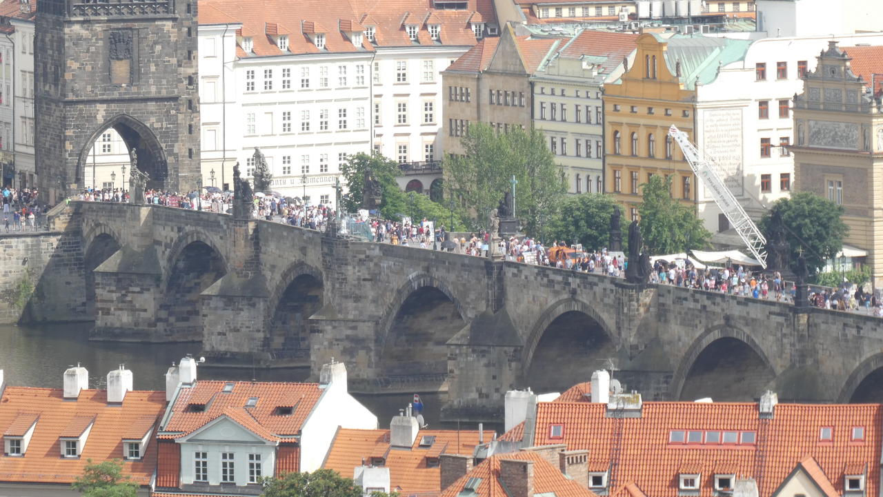 Nach einer halben Stunde waren wir am Hradschin. Wir mußten durch eine Polizeikontrolle, brauchten jedoch zunächst keinen Eintritt zu zahlen, was uns sehr verwunderte. Touristenmassen waren dort unterwegs. Um in verschiedene Gebäude zu gelangen, benötigten wir dann doch eine entsprechende Eintrittskarte. Da hieß es erstmal Schlange stehen. Nachdem wir dann die Karte in der Hand hielten, um in die Vitus-Kathedrale zu gelangen, hieß es wieder lange anstehen. Die Kathedrale war beeindruckend und zudem kühl. Draußen herrschten schon am Morgen hochsommerliche Temperaturen. Nachdem wir uns die Kirche angeschaut hatten und auf dem Innenhof standen, sah ich hoch oben auf dem großen Südturm einige Leute. Da wollte ich unbedingt auch hinauf. Also nochmal Eintritt zahlen und dann es ging die 240 Stufen nach oben. Die Mühe hat sich gelohnt. Der Blick über die ganze Stadt war unbeschreiblich. Danach machten wir erstmal Pause in einem netten Biergarten auf dem Gelände.