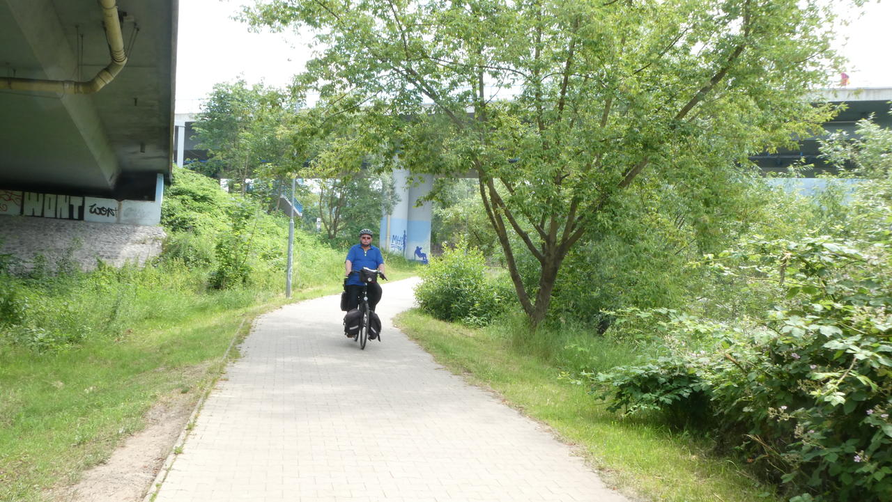 Das Wetter war wieder genauso schön wie an den vorangegangenen Tagen. Wir mußten einmal über die Elbbrücke und schon waren wir auf dem Radweg. Mein Knie spürte ich zum Glück kaum. Ich versuchte, wenn es raufging, hauptsächlich das linke Bein zu belasten. Bei kleineren Steigungen stieg ich vorsichtshalber gleich ab. Nach ca. 7 km kam eine 16 %ige Steigung. Da war klar, daß nur noch schieben ging. Ansonsten verlief der heutige Abschnitt relativ eben. Der Weg war durchgehend asphaltiert und verlief fast immer in Flußnähe.