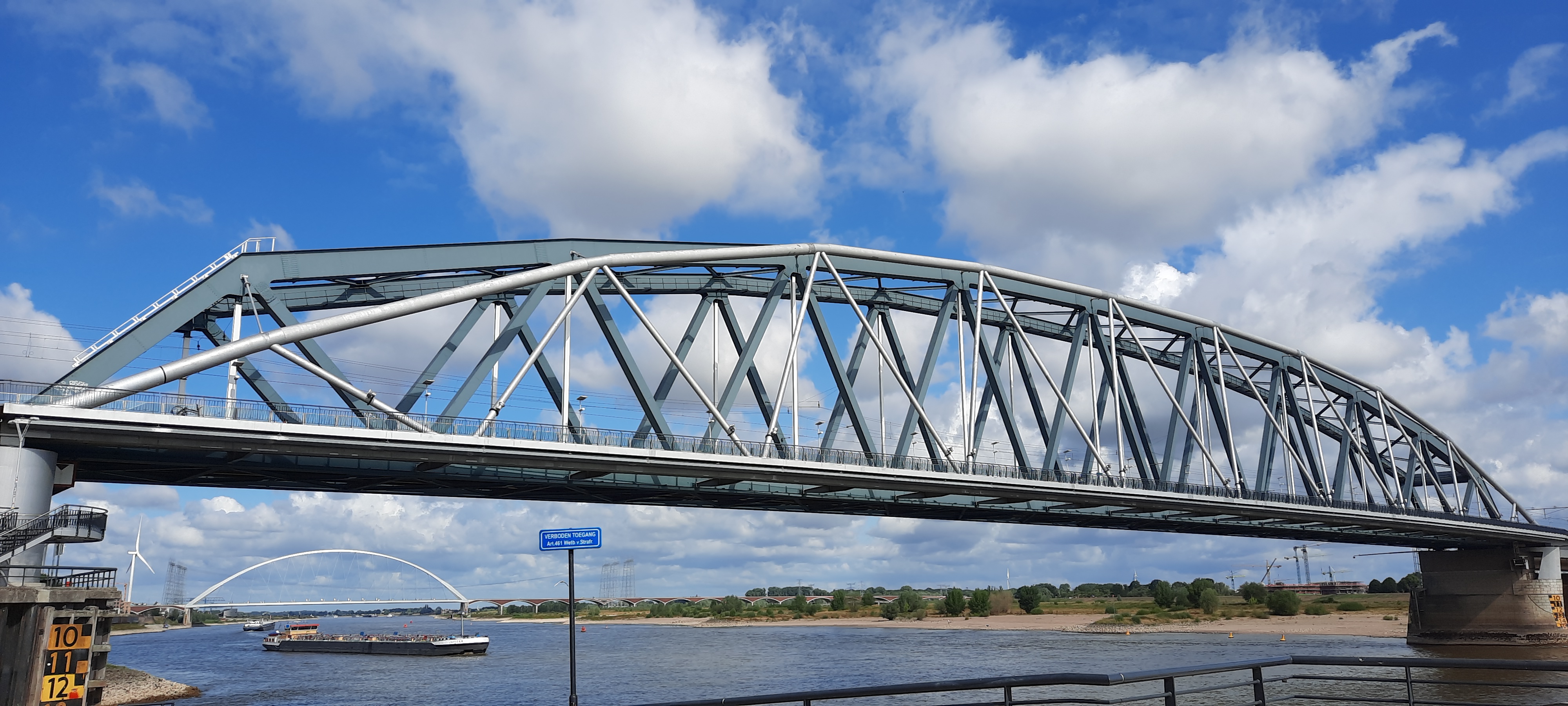 Wir fuhren zunächst zum Stadtzentrum. In einer Bäckerei kauften wir ein paar Brötchen für unterwegs. Dann ging es über die Eisenbahnbrücke Spoorbrug Nijmegen auf die andere Waalseite in Richtung Arnhem.