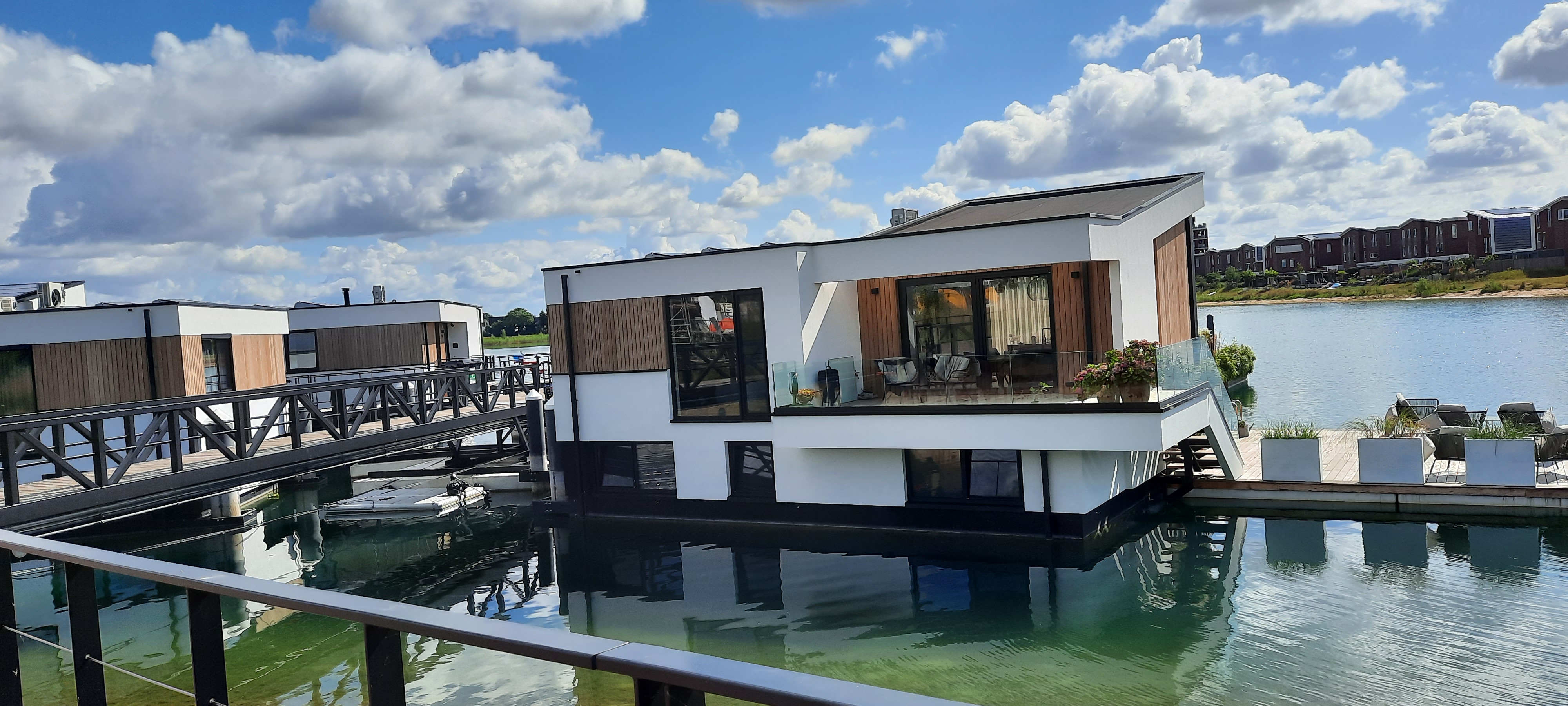 Unterwegs ging es an Wiesen, Feldern und Obstplantagen vorbei. An mehreren Seen; ob natürlich oder ehemalige Kiesgruben weiß ich nicht, entstanden Neubaugebiete auf dem Wasser. Normalgroße, moderne, Einfamilienhäuser wurden auf Plattformen, direkt auf dem Wasser errichtet. Ein Hochwasser kann da nicht gefährlich werden, dann ist der Steg nur etwas höher. Das kannte ich bisher nur als kleine schwimmende Ferienhäuser.