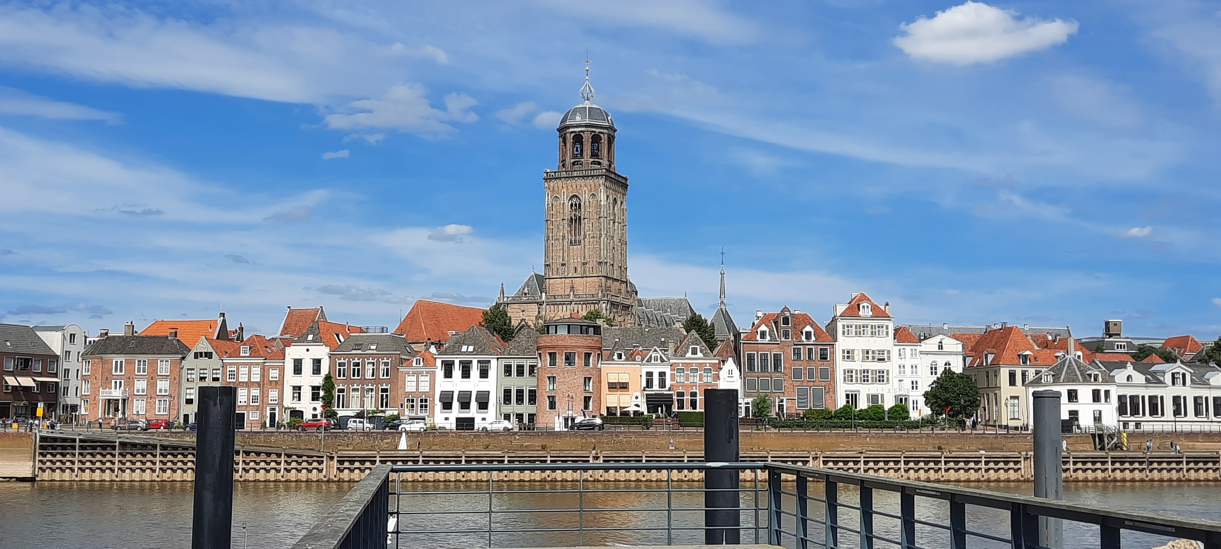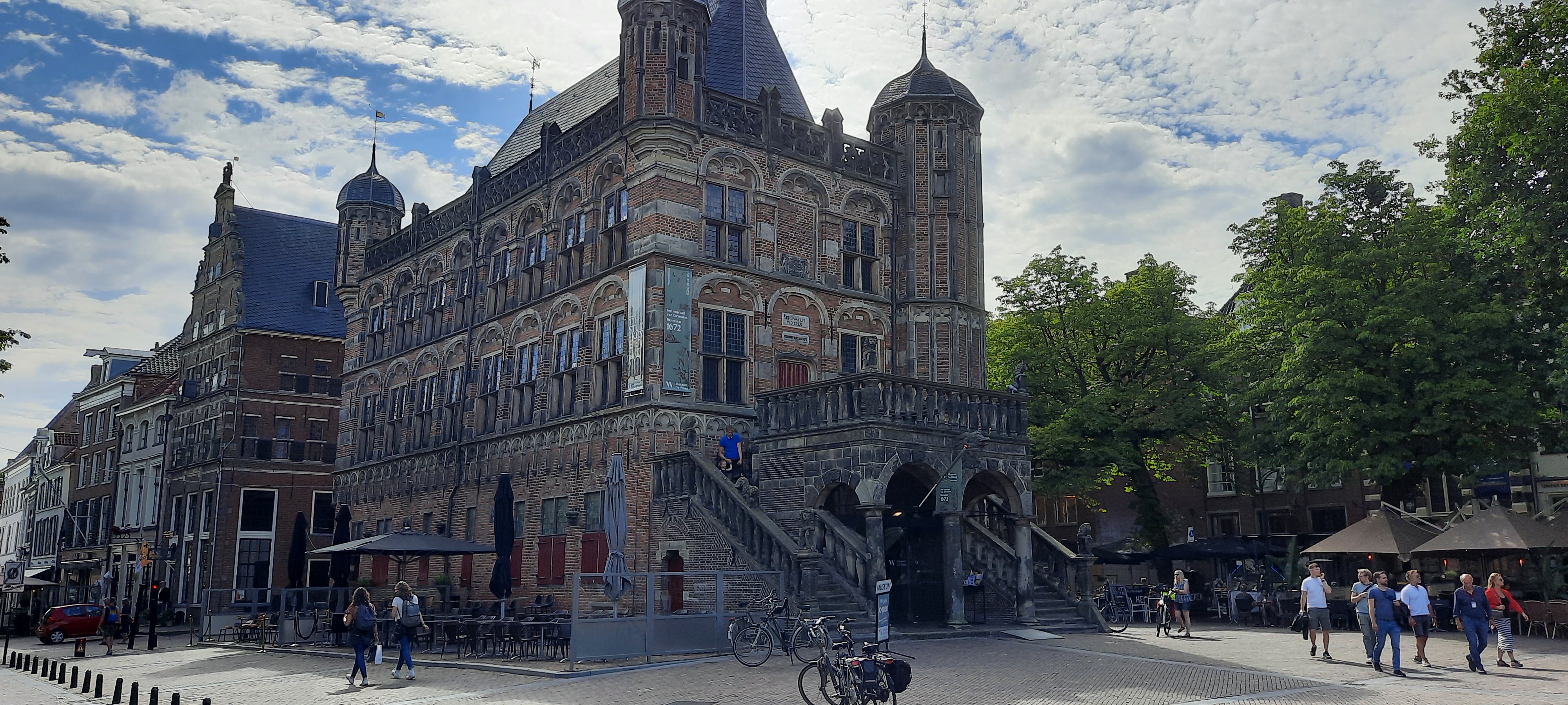 Diesmal überquerten wir den Fluß mit Hilfe einer kleinen Personen- und Radfähre. Gegen 16 Uhr waren wir in Deventer. Diese Stadt war ein weiteres Highlight unserer Radtour. Zuerst gelangten wir zur Grote St. Lebuinuskerk, deren ungewöhnliche Turmkuppel schon weit vor der Stadt zu sehen ist. Wir folgten den Radwegschildern um die Kirche herum. Dort, am grote Kerkhof standen neben dem Rathaus, mehrere sehenswerte, alte Stadthäuser.
