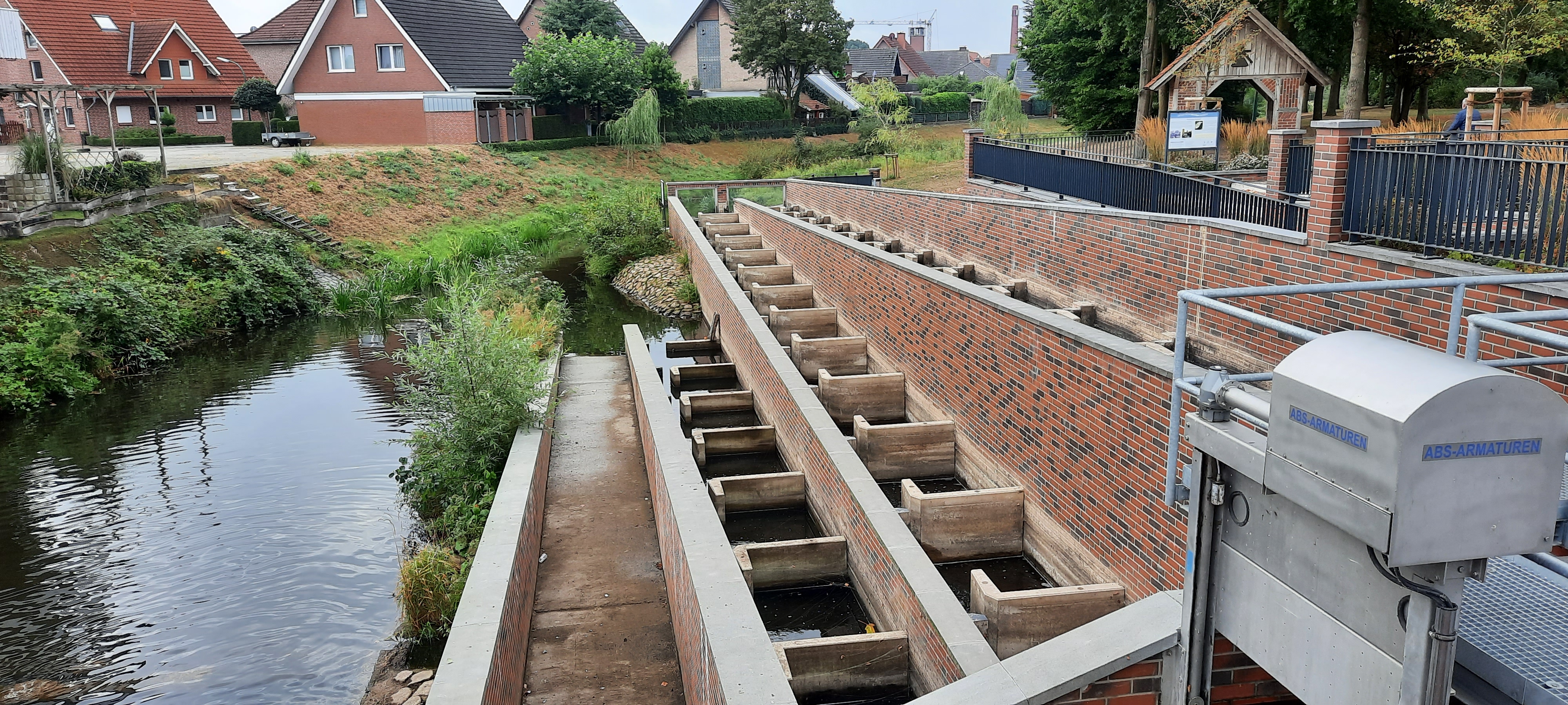 Unser erstes Etappenziel war der Stadtpark von Ramsdorf. Hier bestaunten wir eine große Fischtreppe an der Bocholter Aa. Danach ging es weiter, an der Burg Ramsdorf vorbei, bis zur St. Walburga Kirche. Vor der Kirche fotografierten wir zwei nette Bronzefiguren, vermutlich Vater und Sohn. Ein paar Meter weiter befindet sich das Heimathaus von Ramsdorf. Es hatte leider geschlossen. Vor dem Gebäude standen alte Gerätschaften aus früheren Schmieden.