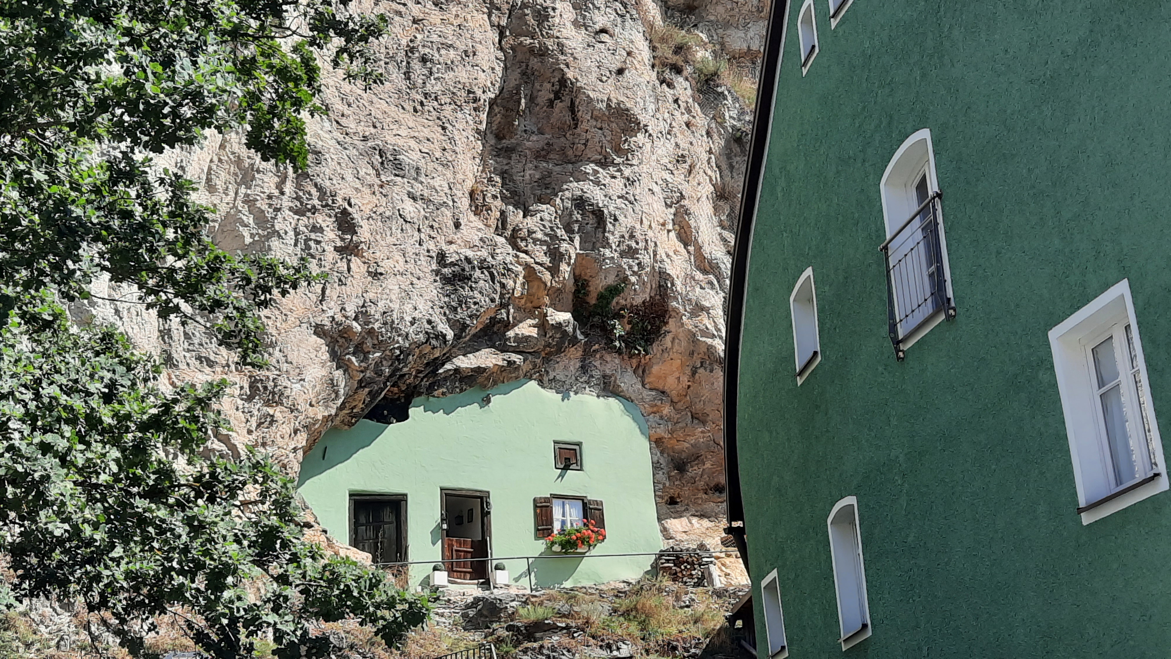 Nach zwei Stunden waren wir in Kallmütz. Das Örtchen ist sehr malerisch. Es liegt direkt unterhalb einer Felswand und unmittelbar am Ufer der Vils. Einige Häuser sind sogar in den Fels gebaut. Eine schmale, gepflasterte Straße mußten wir uns mit Autos und Fußgängern teilen. Diesen hübschen Ort wollten wir nun doch etwas länger genießen und gönnten uns eine Pause. Ein leckerer Eiskaffee kühlte uns innerlich ab.