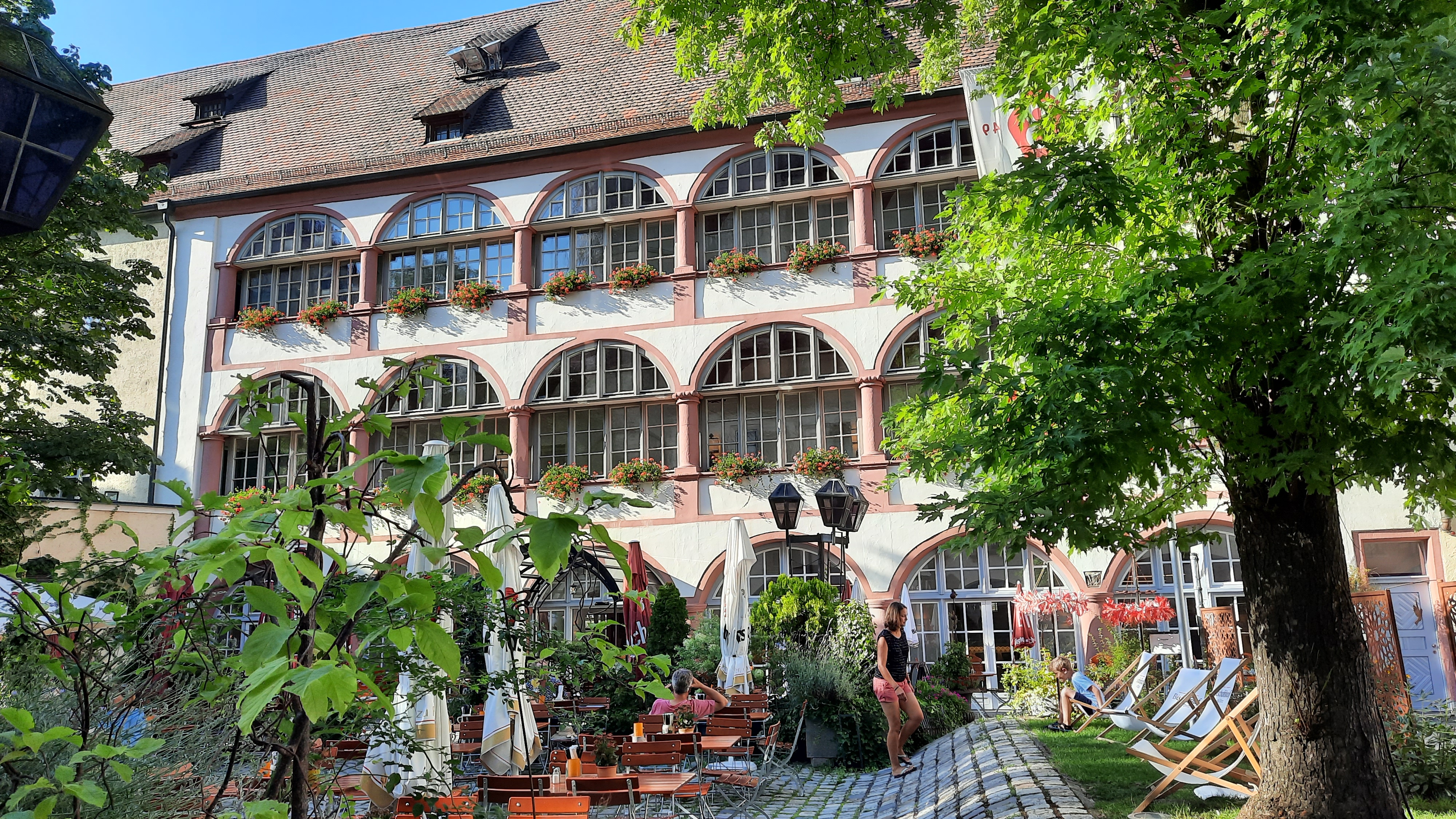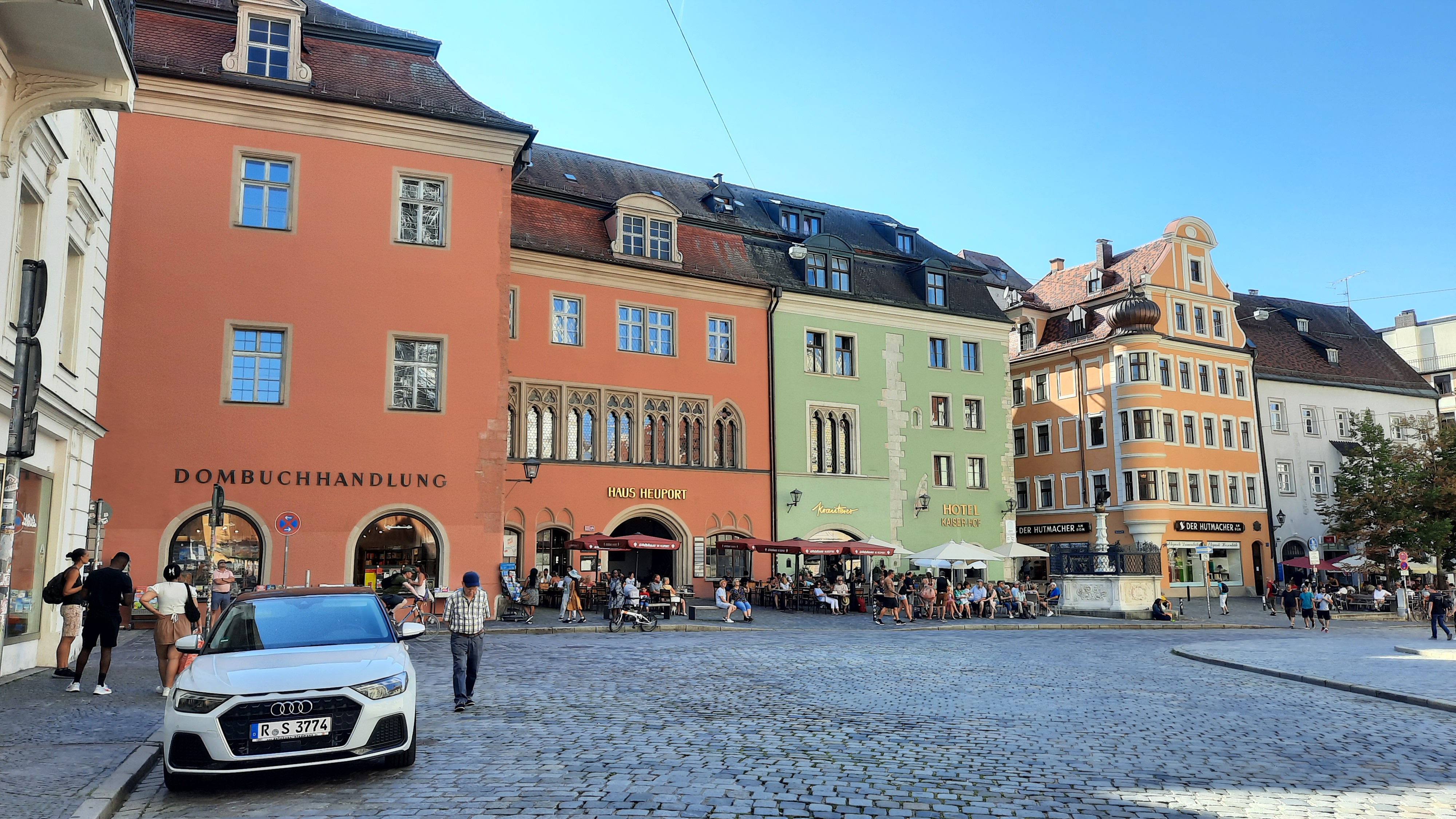 Wir mußten einige Kilometer an der Bundesstraße entlangfahren. Wenig später erreichten wir den Stadtrand von Regensburg. Wir überquerten den Europakanal, den Donau-Nord-Arm und den Donau-Süd-Arm am Laufwasserkraftwerk Regensburg. Im Nachhinein gesehen hätten wir auf der anderen Donauseite weiterfahren können. Schon bald waren wir in der Innenstadt und fanden schnell unser Hotel direkt am Park von Schloß Emmeram. Leider haben wir Füstin Gloria nicht entdeckt. Unsere Fahrräder standen diesmal im Gastraum.