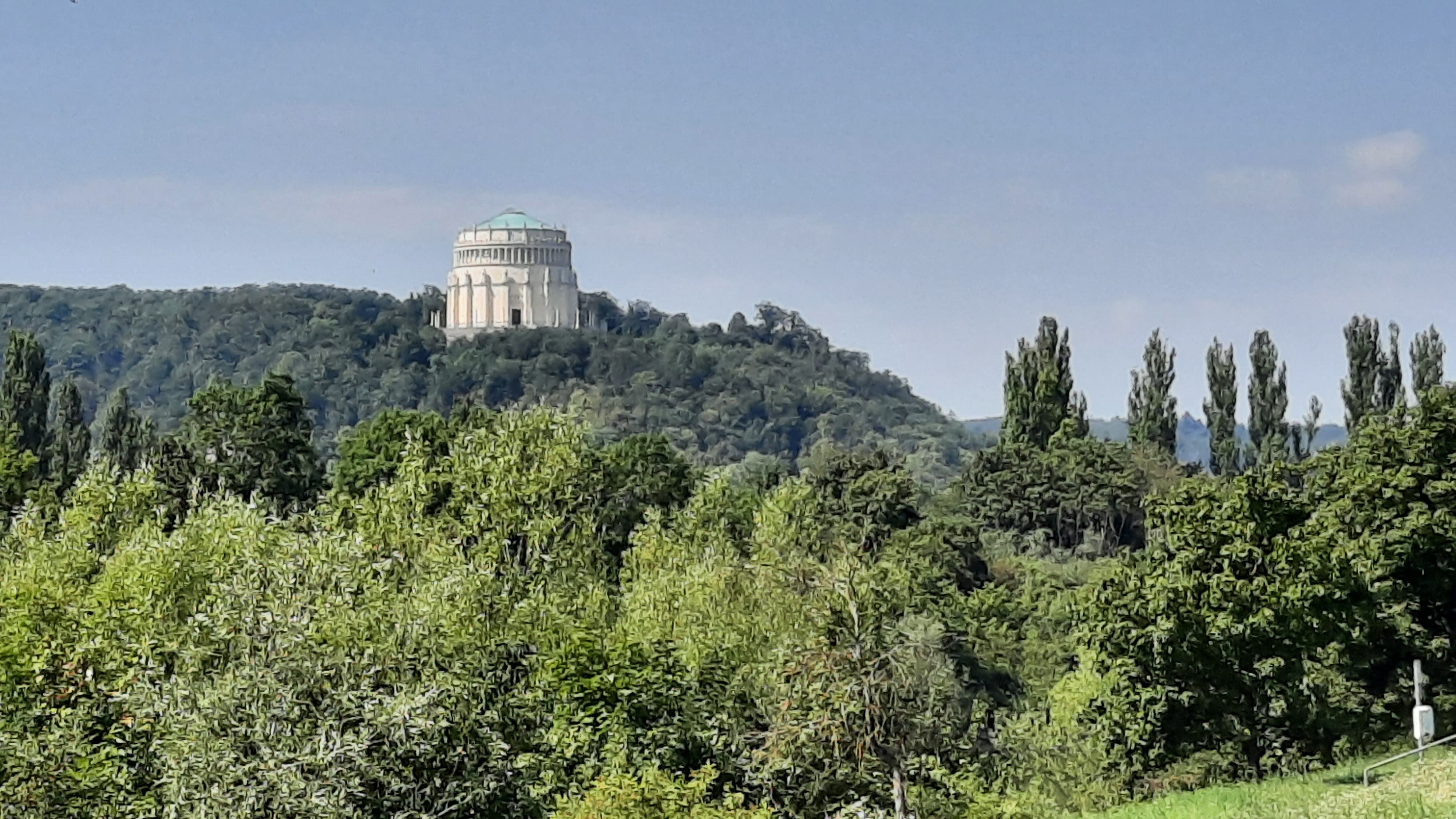 Vom weitem sahen wir die Befreiungshalle, hoch oberhalb von Kehlheim. Den Besuch und die Aussicht von oben sparten wir uns. Mit dem Rad dort hochzuschieben war uns dann doch zu anstrengend. Als wir Kehlheim erreichten, machten wir im ersten Gasthof eine gemütliche Kaffee- und Kuchenpause. Anschließend fuhren wir eine Runde durch den malerischen Ort. Die Kneippanlage, von der uns ein Gast beim Kaffeetrinken erzählt hatte, fanden wir leider nicht. Das wäre jetzt die richtige Erfrischung gewesen.
