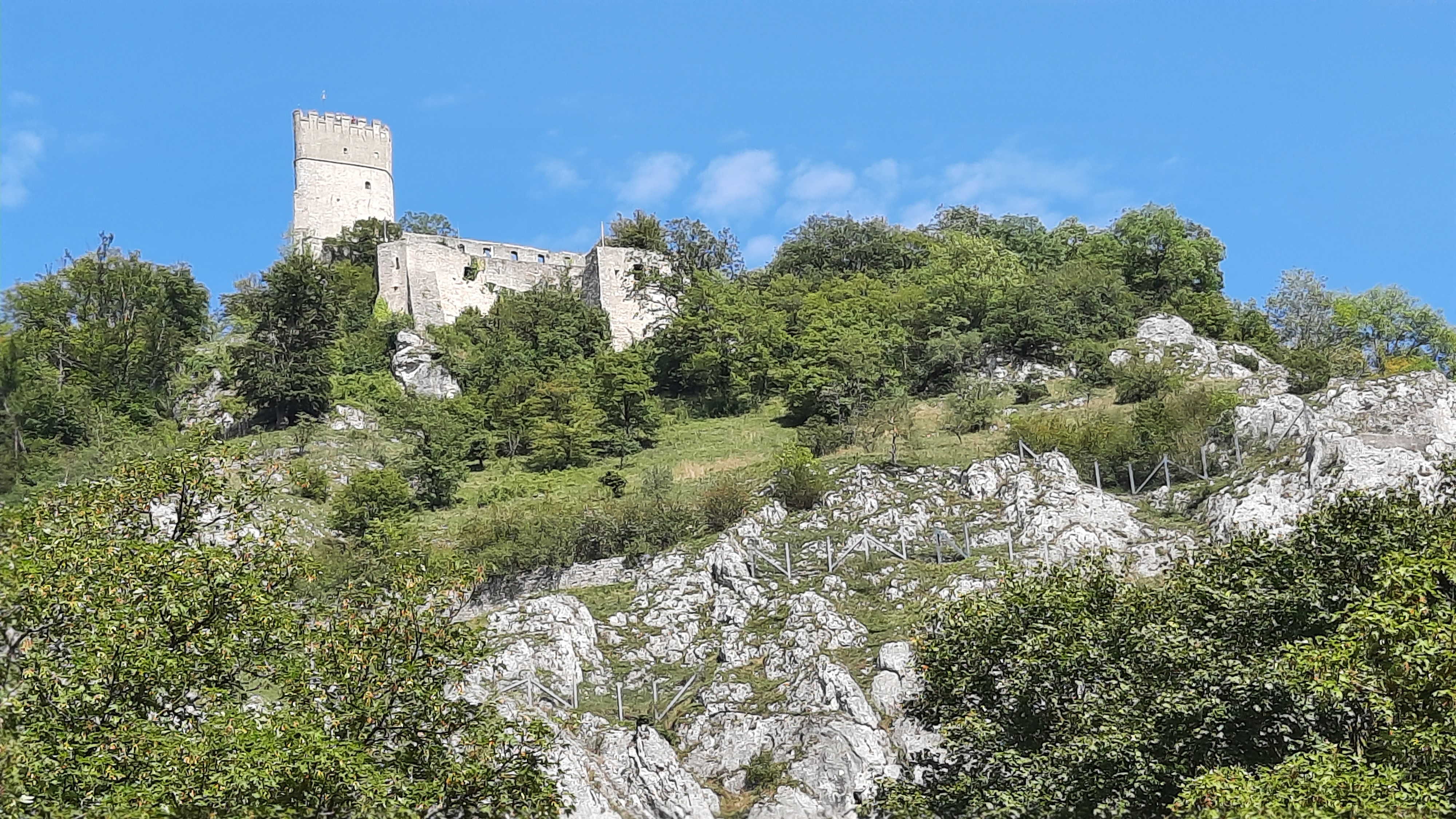 Ein Stück weiter erblickten wir auf einem 70 Meter hohen Felsvorsprung die Ritterburg Prunn. Schon von weitem erkennt man auf der weißen Mauer ein rotes Wappen mit einem weißen, aufbäumenden Pferd. Sie zu besichtigen, wäre sicher interessant. Das hebt man sich aber besser für eine Tour mit dem Auto auf.