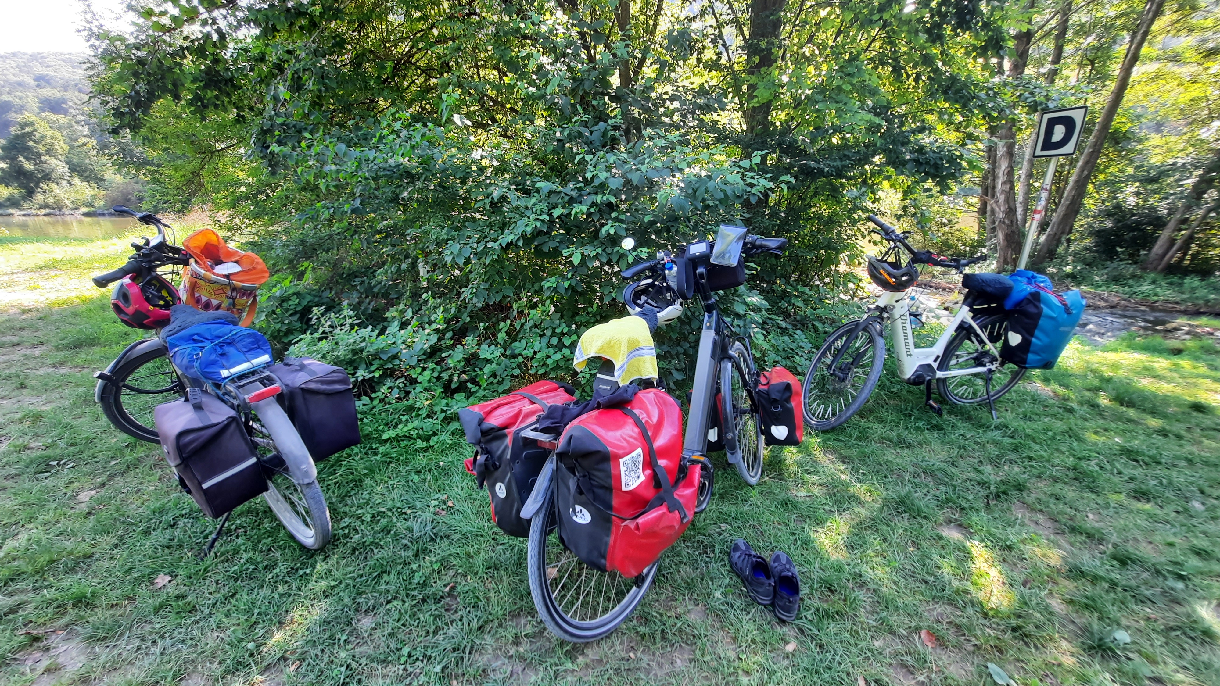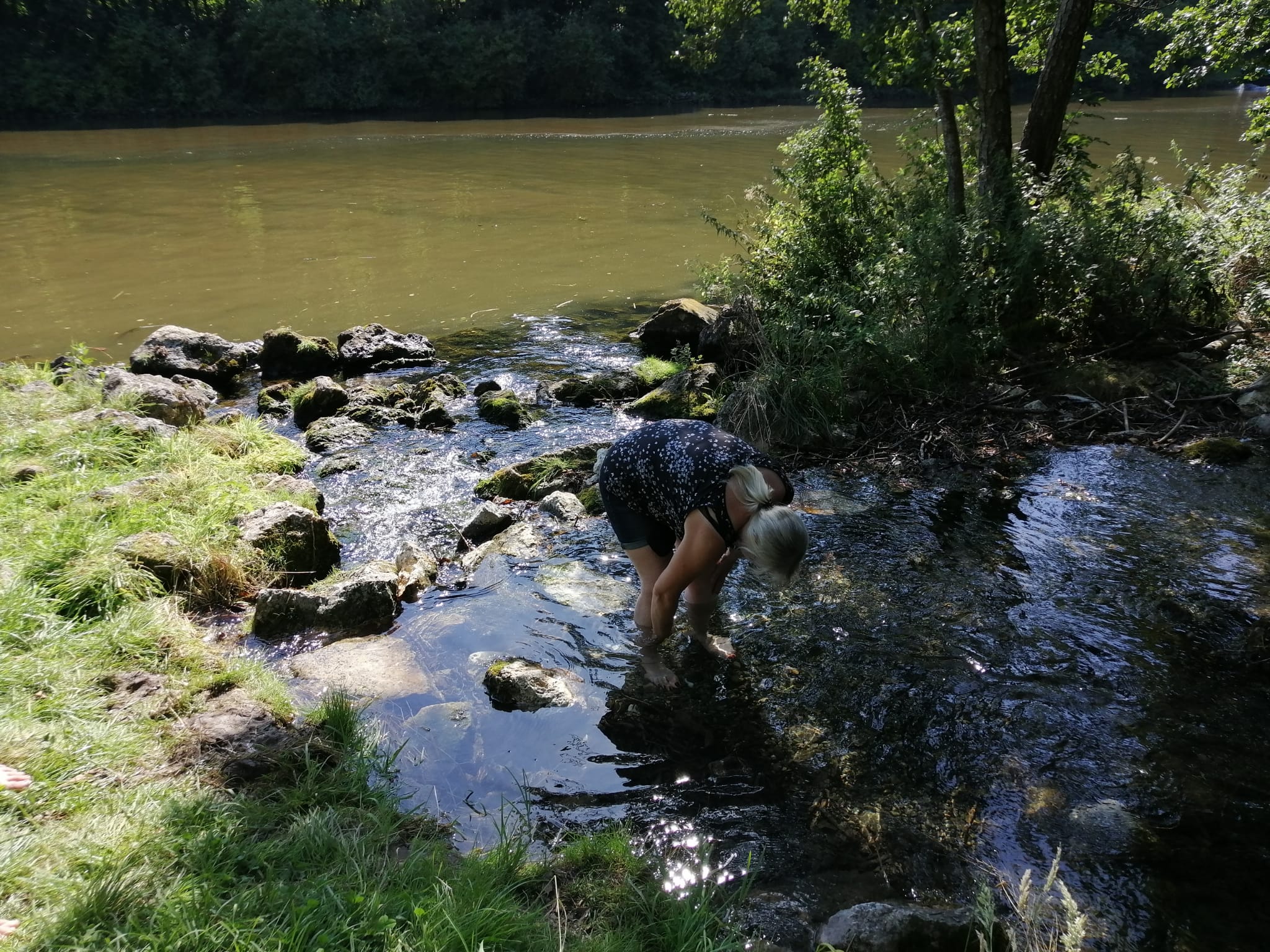 Konny fuhr voran und stoppte plötzlich. Wir dachten, sie wolle eine Trinkpause einlegen. An einem kleinen Rastplatz mit Holztischen und Bänken waren gerade ein paar Radfahrer dabei, sich Strümpfe und Schuhe anzuziehen. Als wir näherkamen, sahen wir auch warum. Ein kleiner, flacher Bach, der in die Altmühl mündete, hatte ihnen als Kneippbecken gedient. Das kam für uns wie gerufen. Ruck zuck waren wir barfuß und stiegen vorsichtig ins eiskalte Wasser. Das war herrlich. Nach einer halben Stunde setzten wir erfrischt unsere Tour fort.