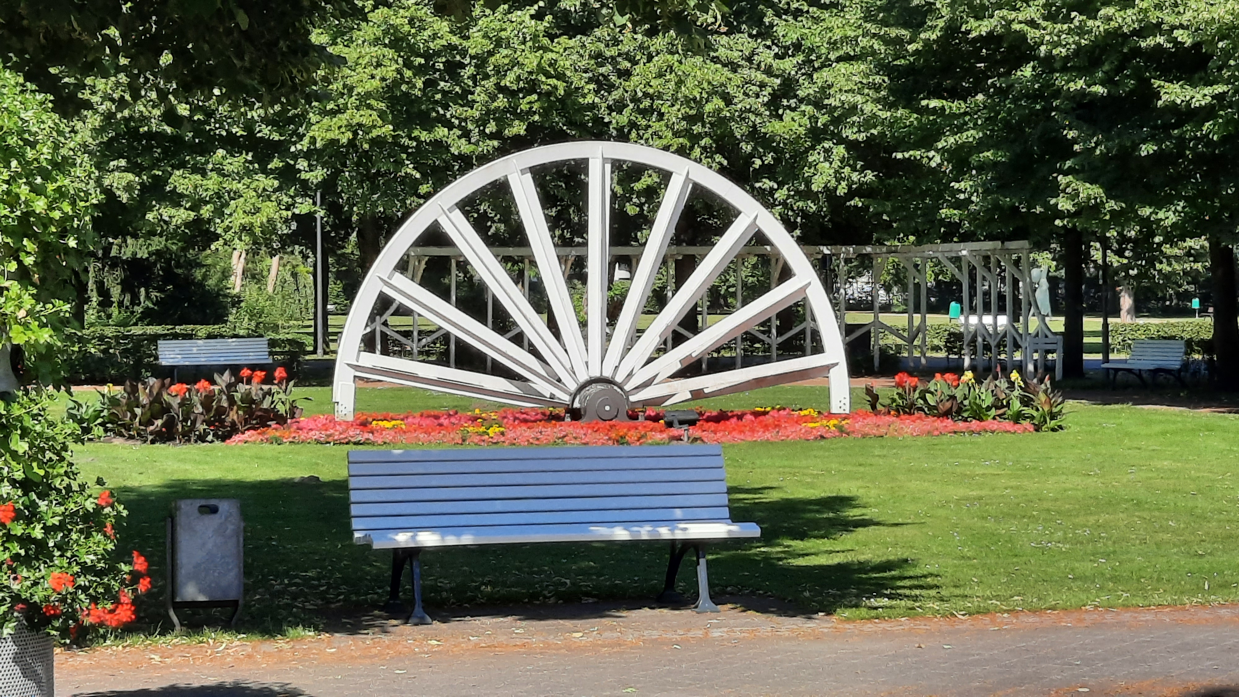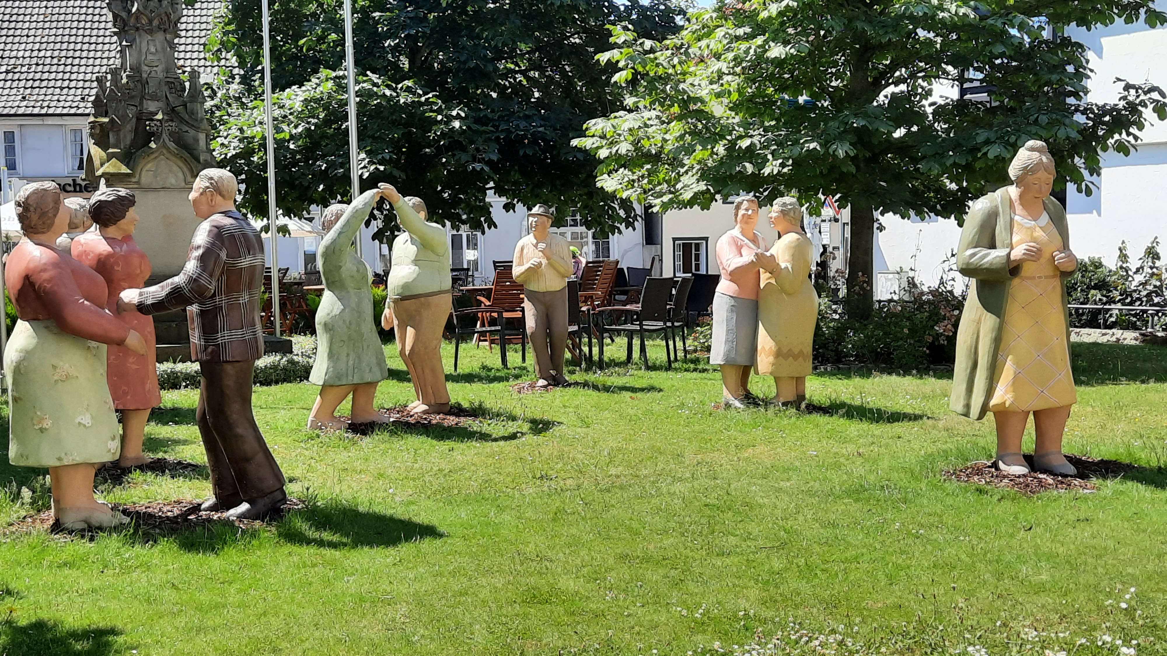 Gegen 10.30 Uhr fuhren wir durch ein große Straßenbaustelle, die wir schiebend bewältigten. Es ging weiter nach Wiedenbrück. Dort kamen wir an einer Gruppe älterer Herrschaften vorbei, die im Park ein Tänzchen wagten. Beim genaueren Hinsehen erkannten wir, es waren Alltagsmenschen. Das sind lebensechte Figuren, die sehr sympathisch rüberkommen. In der ganzen Stadt begegneten wir noch mehreren der freundlichen Skulpturen.