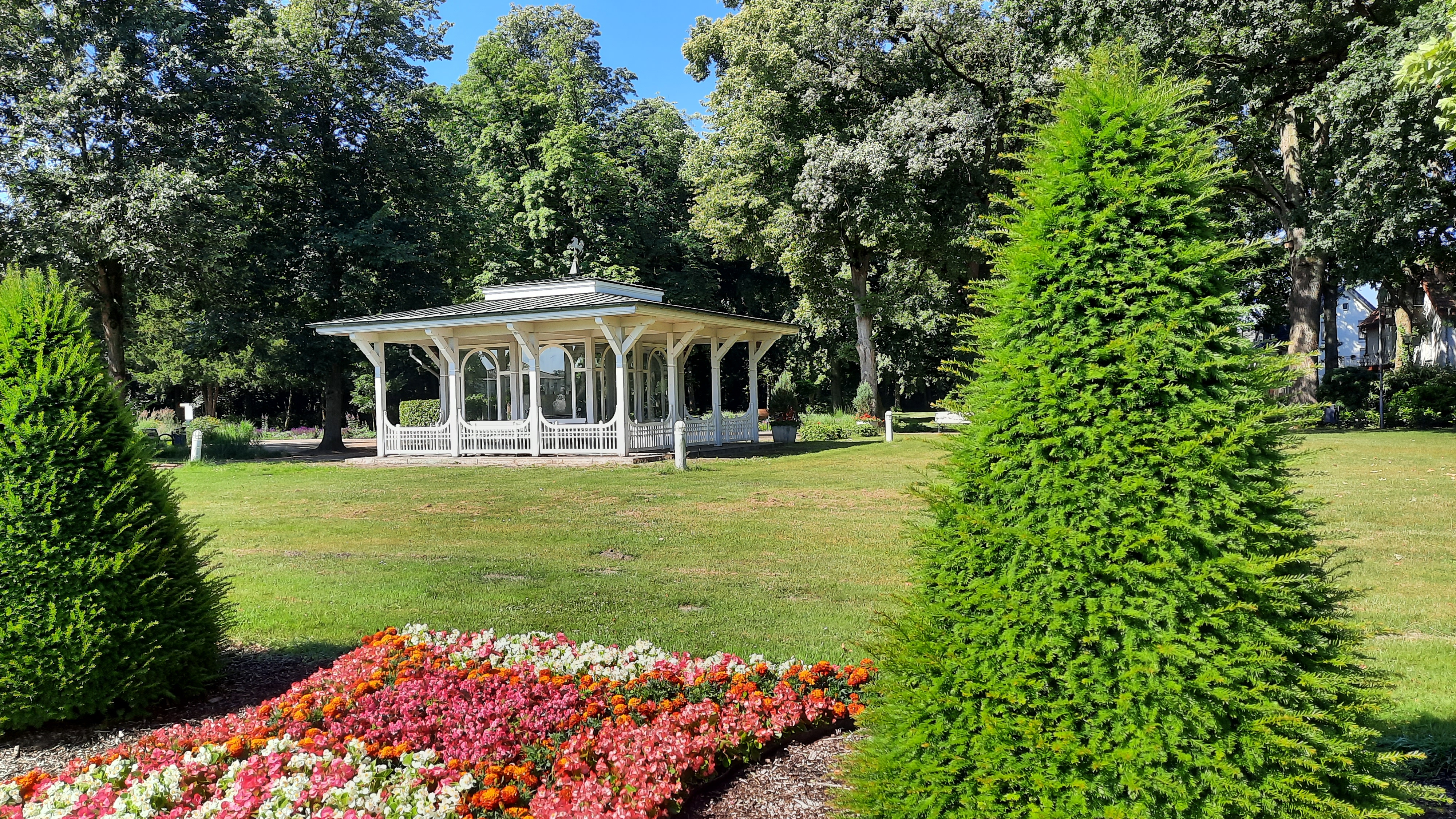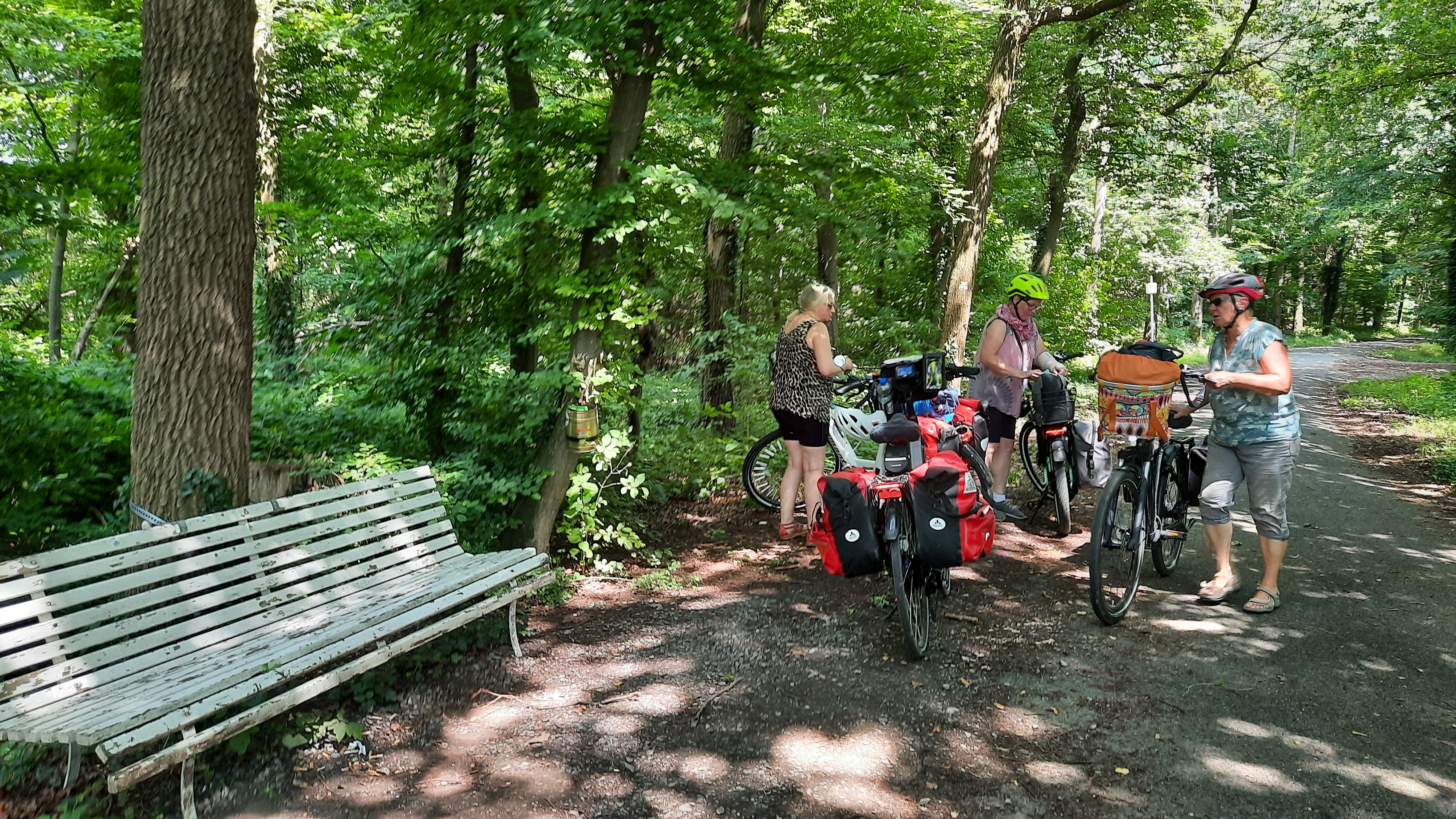 Danach fuhren wir am Emssee vorbei, durch einen schön angelegten Park und gelangten dann nach Rheda. Am Schloßpark machten wir einen kurzen Fotostop. Einige Kilometer weiter aßen wir auf einer Bank im Wald unsere Brötchen, die wir am Morgen gekauft hatten. Danach gab Konny noch eine Runde Streuselkuchen aus. So gestärkt ging es dann nach Gütersloh. Auf einen ausführlichen Stadtbummel verzichteten wir, sondern füllten nur unsere Flüssigkeitsspeicher noch mal auf.