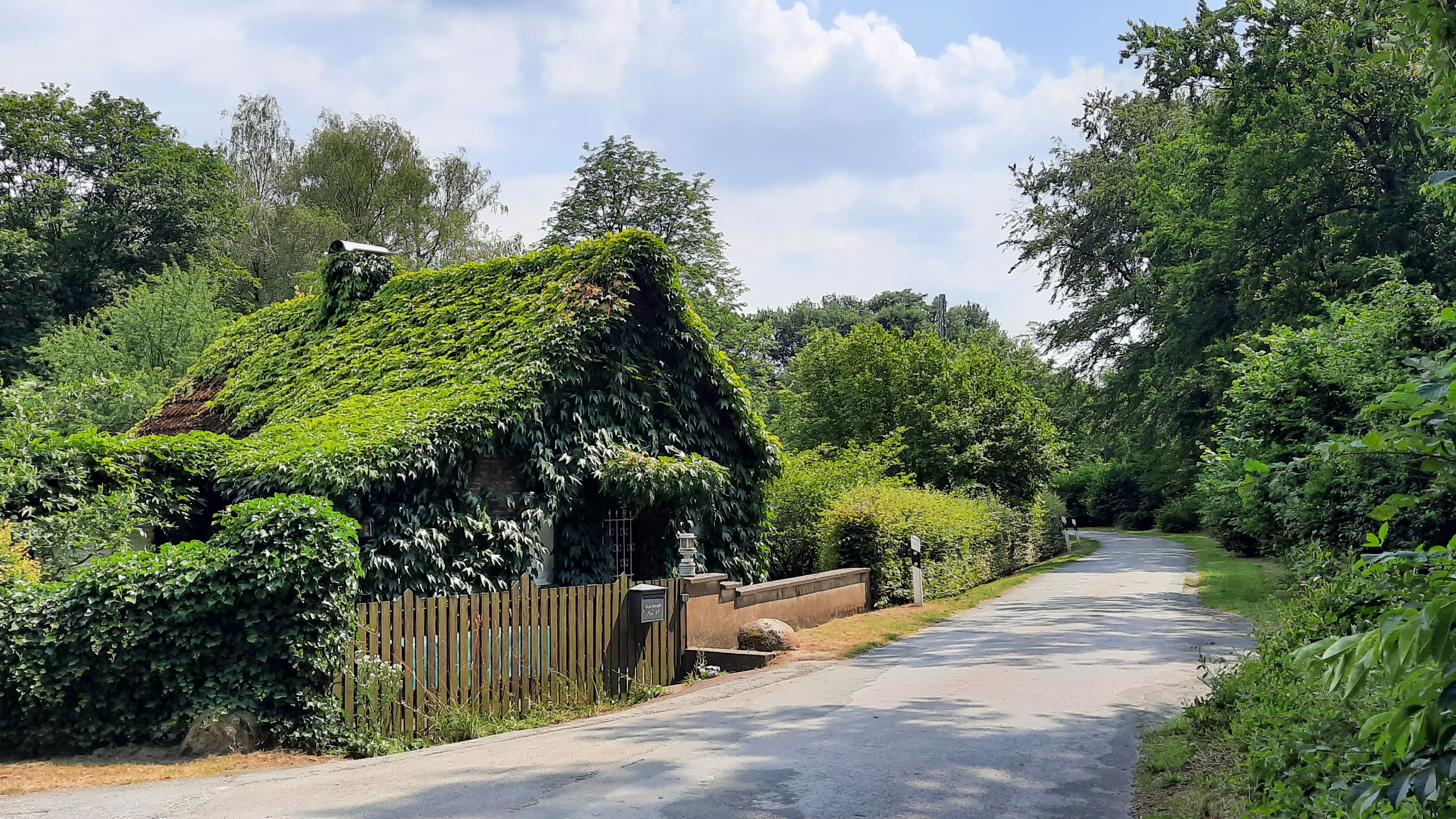 Der Weg führte uns an den Bethel-Einrichtungen vorbei. Wir orientierten uns zusätzlich an den Knotenpunkten. Der Weg stieg zusehends an. Dann kam noch eine Straßenbaustelle, die für Autos gesperrt war. Etwas unschlüssig standen wir an einer Abzweigung und überlegten, wie wir weiterfahren sollten. Da kam uns eine Radfahrerin zu Hilfe. Sie erklärte, daß man mit dem Rad die Straße befahren könnte. Trotz E-Bike mußten wir uns kräftig anstrengen, den Berg hinauf zu kommen. Nachdem wir den Bergrücken geschafft hatten, fanden wir schnell einen schönen Weg durch einen großen Park, den uns die freundliche Radlerin beschrieben hatte. Hier lief es bedeutend besser und streßfrei.